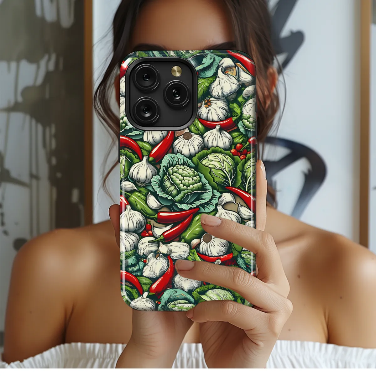 Indulge in a culinary adventure with this whimsical phone case adorned with vibrant cabbages, fiery chilies, and fragrant garlic. Let your smartphone become a canvas for your love of all things tantalizing. Each ingredient is lovingly rendered in vivid detail, promising to ignite your taste buds and bring a touch of culinary flair to your everyday life. Compatible with iPhone, Samsung, and Pixel devices, this case not only protects your phone but also adds a dash of fun and flavor to your tech accessories.