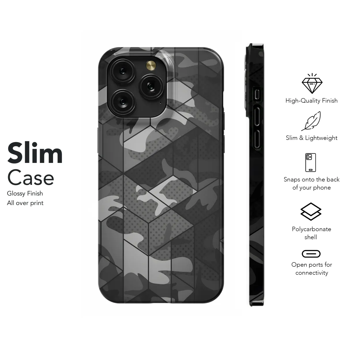 Upgrade your style with this sleek, geometric camo design. The sophisticated grayscale palette blends seamlessly with modern aesthetics, offering a subtle yet impactful statement. This unique pattern features a captivating interplay of abstract shapes and camouflage elements, creating a visually stunning and eye-catching design. The intricate details and high-quality print ensure a vibrant and long-lasting finish. Perfect for those who appreciate understated elegance and a touch of edgy flair, this design effortlessly elevates your everyday look. Show off your individuality with this exclusive design, printed with precision on a durable, protective surface. Its slim profile provides a comfortable grip and optimal device protection without adding bulk. This stylish accessory is more than just a protective layer—it's a personalized expression of your unique taste and a conversation starter. Give your device a modern makeover with a design that's both fashionable and functional. This design is also a great gift for friends and family who appreciate stylish and protective accessories. Secure yours today and stand out from the crowd!