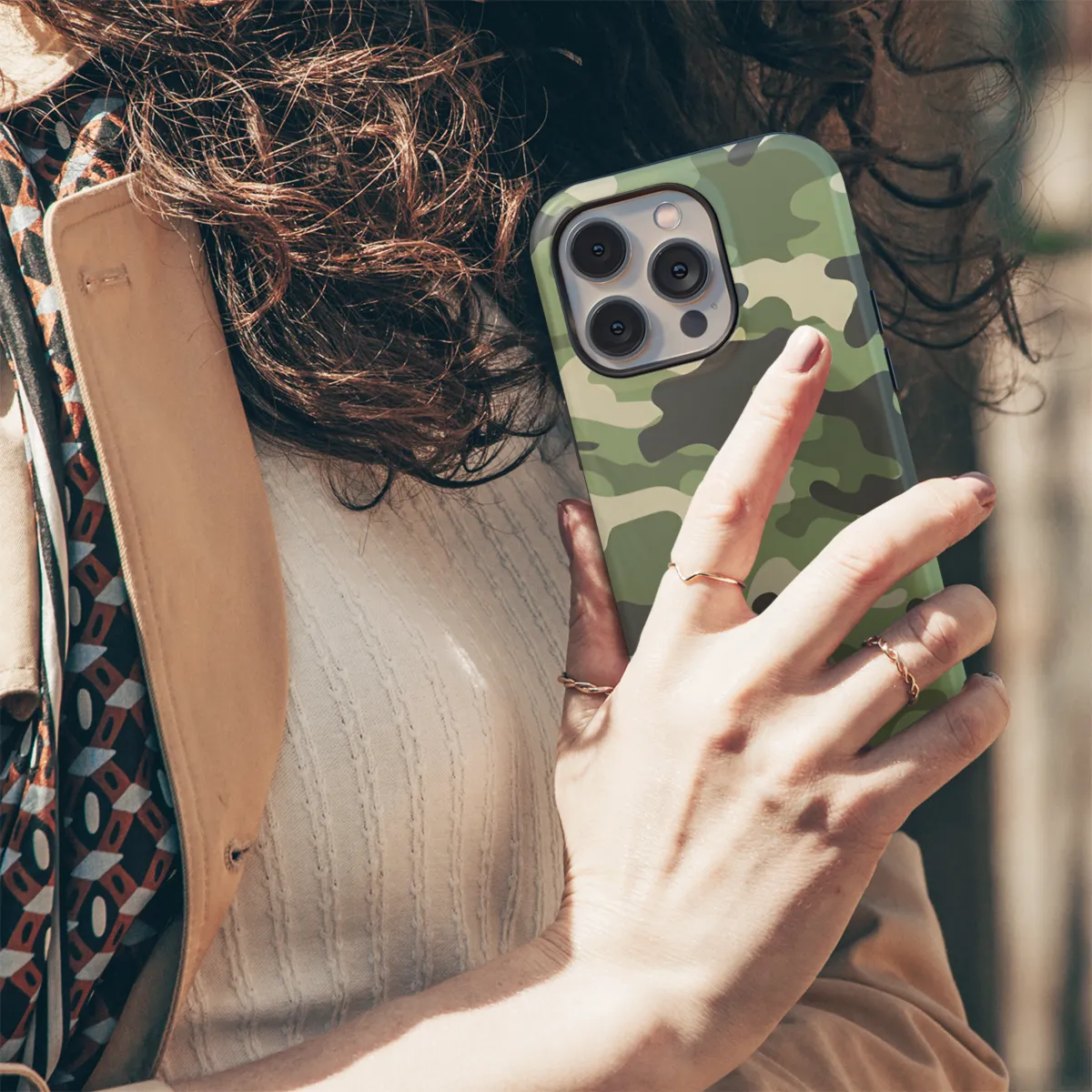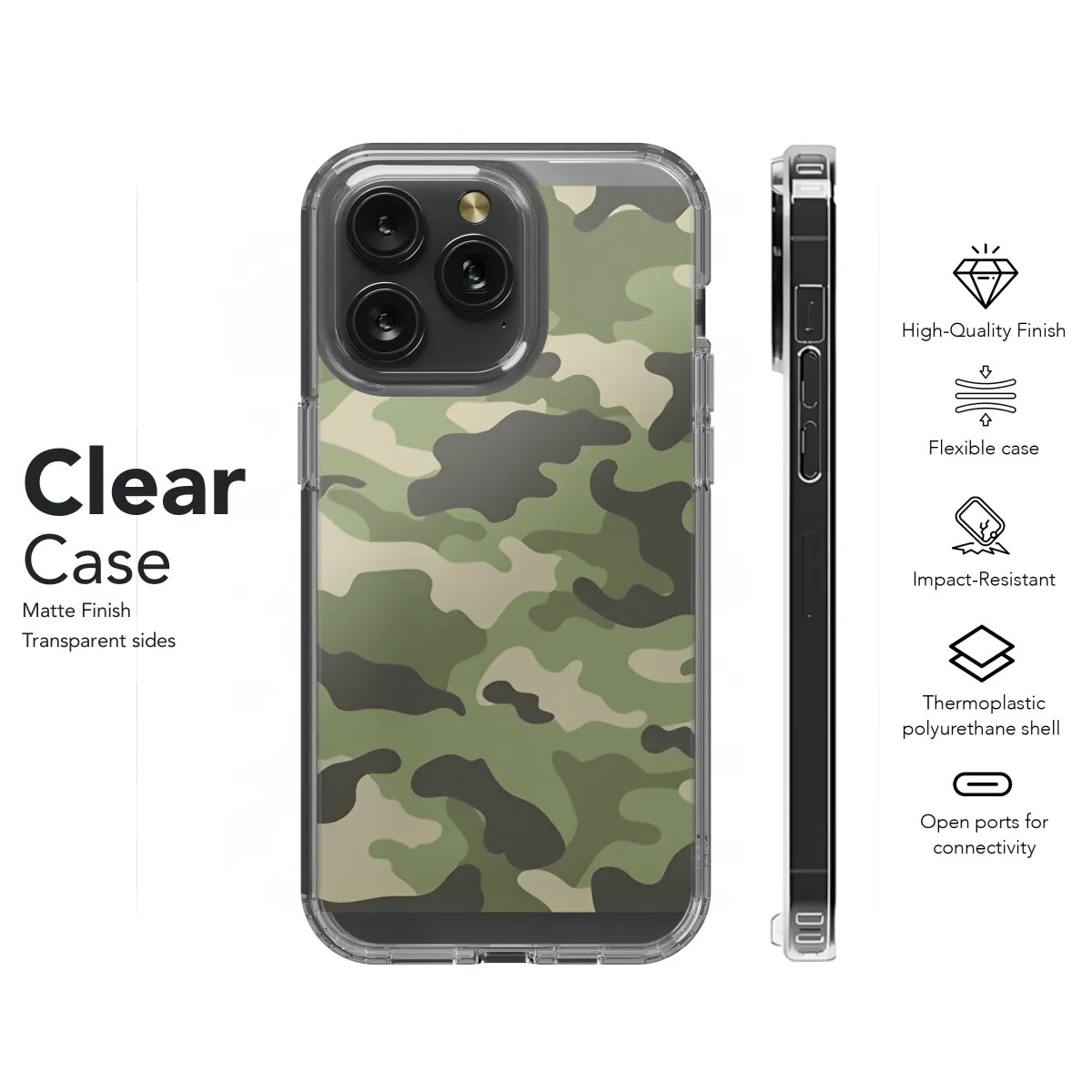 **Camouflage Your Phone in Style** Protect your smartphone with our durable and stylish camouflage phone case. With its rugged design, your phone will be shielded from bumps, scratches, and drops. The eye-catching camouflage pattern adds a touch of military-chic to your device. **Features:** * Fits perfectly for iPhone, Samsung, and Pixel models * Durable construction to protect against damage * Anti-slip grip for secure handling * Vibrant camouflage print for a unique look