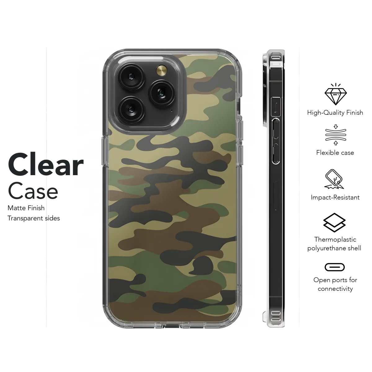 Protect your phone in style with our durable camouflage phone case. Designed for iPhone, Samsung, and Pixel, this case features a sleek camouflage pattern that will keep your device looking its best. The case is made from a high-quality TPU material that provides excellent protection from scratches, drops, and bumps. It also has a raised lip around the screen to help protect it from scratches. The case is easy to install and remove, and it won't interfere with your phone's functionality.