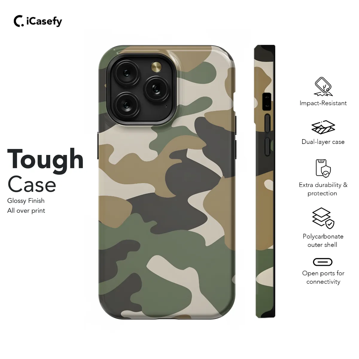 Protect your phone in style with our exclusive Camouflage Phone Case. Designed for iPhone, Samsung, and Pixel devices, this case offers a sleek and rugged look with its military-grade camouflage print. Its durable construction withstands drops and impacts, while raised edges safeguard your screen from scratches. The case's precise cutouts ensure easy access to buttons, ports, and speakers. Choose from various camouflage patterns to match your unique style and stay protected on the go.