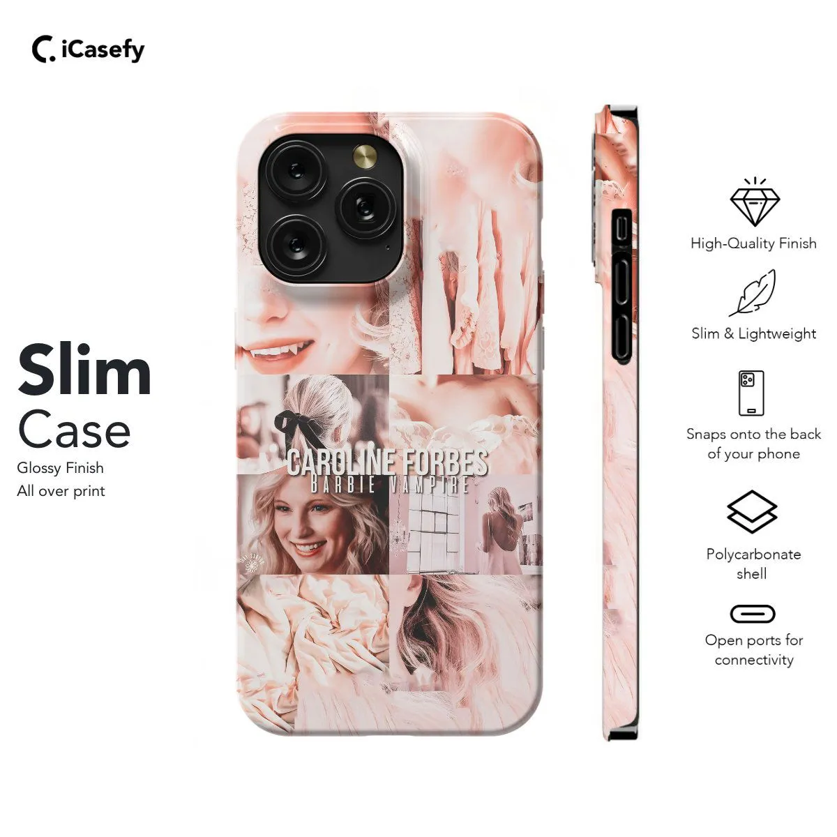 Celebrate the dynamic character of Caroline Forbes from The Vampire Diaries with this captivating phone case featuring a collage of iconic moments from the series. From her transformation into a vampire to her growth as a leader, this accessory pays homage to Caroline's journey and resilience. Carry a piece of Mystic Falls with you wherever you go and let your device become a tribute to the strength and complexity of this beloved character with this stylish and meaningful case.