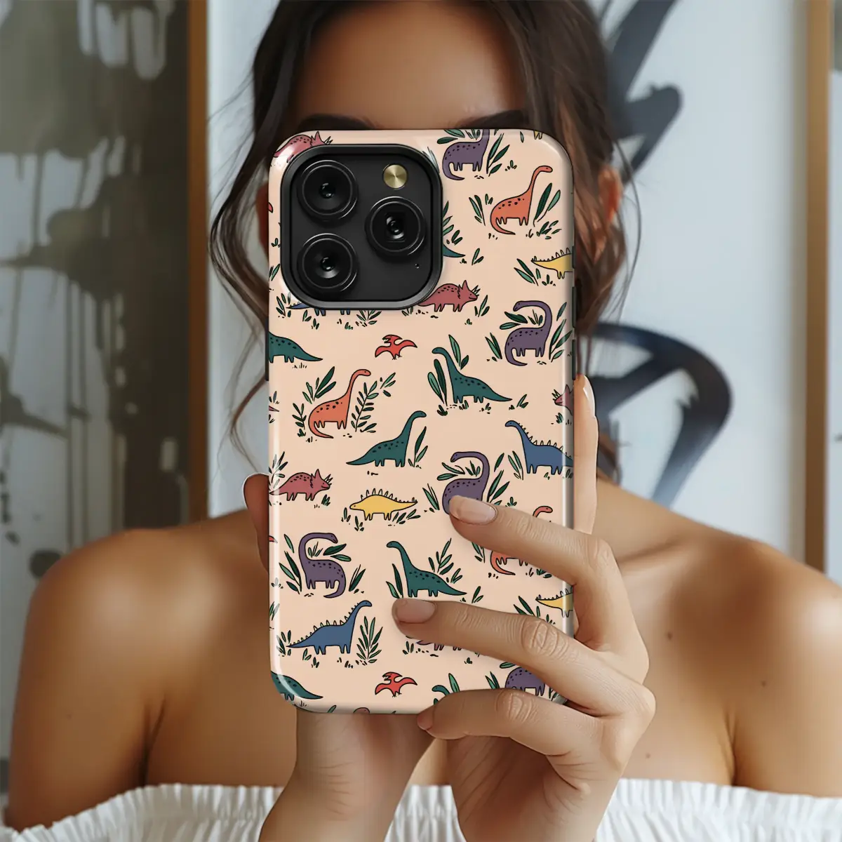 Embrace a touch of prehistoric fun with this delightful dinosaur pattern. This charming design features a playful assortment of hand-drawn dinosaurs, including Brontosaurus, Triceratops, and Stegosaurus, scattered amongst simple green foliage. The warm, earthy color palette on a soft beige background gives it a gentle, whimsical feel, perfect for anyone who loves a cute and quirky aesthetic.