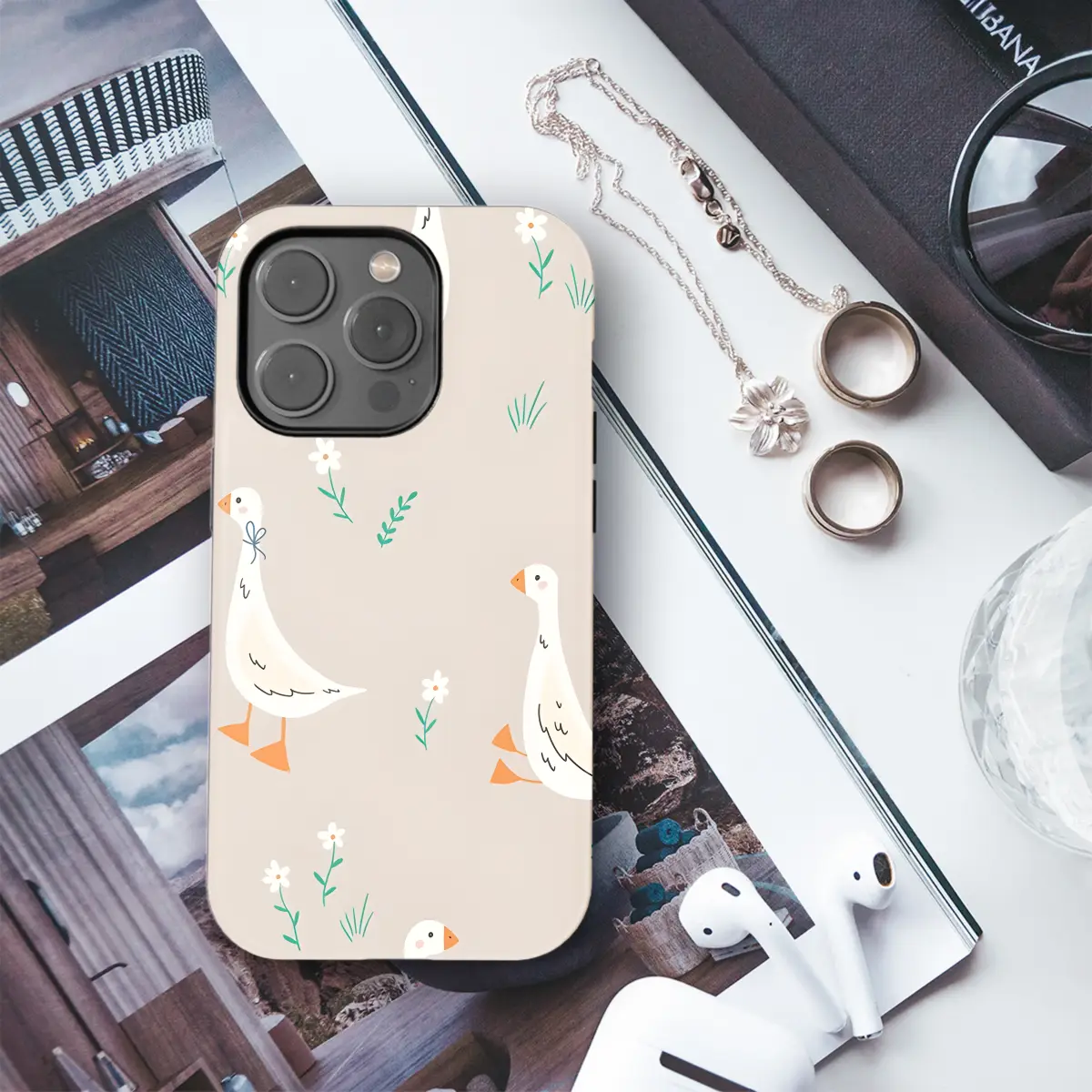 This eye-catching phone case features an adorable cartoon goose design adorned with vibrant flowers. Protect your device in style with this charming and durable cover, available for iPhone, Samsung, and Pixel handsets.