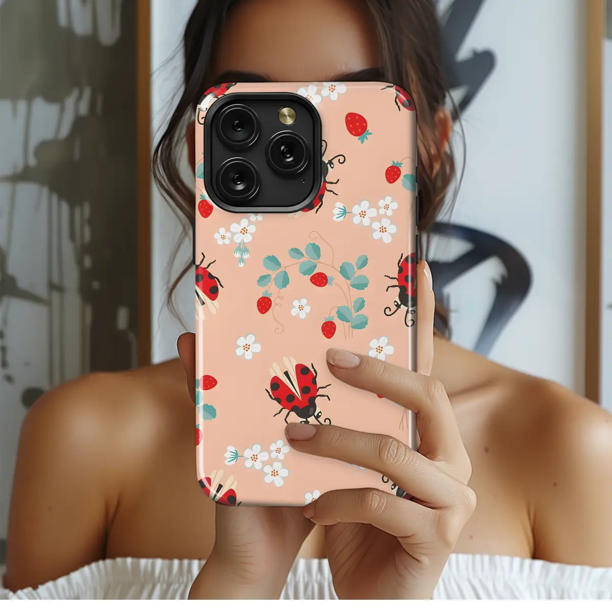 Protect your phone in style with this adorable cartoon ladybug and strawberry phone case. Made from durable materials, this case will shield your device from scratches, bumps, and everyday wear and tear. The vibrant colors and playful design will add a touch of whimsy to your phone, making it the perfect accessory for kids or anyone who loves cute and trendy phone cases.