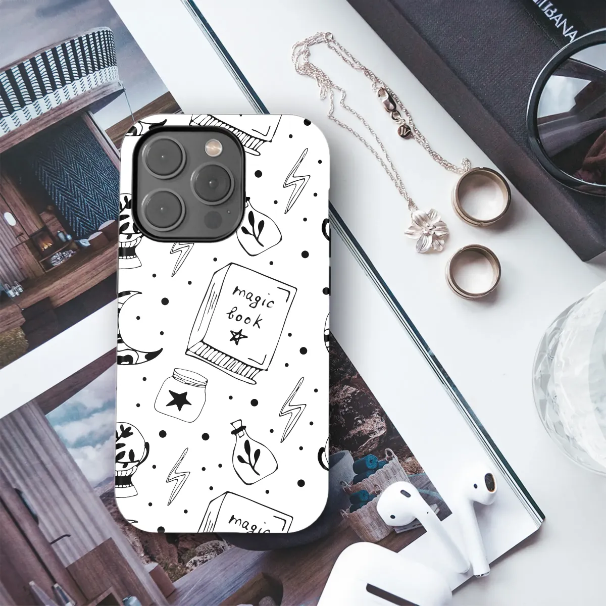 Embrace the enchanting world of witchcraft and celestial wonders with this mesmerizing mystical accessory, designed for the modern mystic and bohemian soul. Featuring a unique, hand-drawn doodle pattern in a striking black and white monochrome palette, this design is a beautiful celebration of all things magical and esoteric. Discover the intricate line art illustrations of a sacred magic book waiting to be opened, a fortune-telling crystal ball revealing a hidden sprig, a beautifully patterned crescent moon hanging in a dotted sky, potent elixir bottles, and jars filled with captured starlight. The entire scene is scattered with crackling lightning bolts, capturing a moment of powerful energy. The sketchbook-style art gives it an authentic, personal feel, perfect for anyone with an alternative, goth, or e-girl style, offering a touch of occult elegance to your everyday essentials. Crafted to be a durable yet lightweight and sleek guardian for your most-used handheld device, this protective covering shields your tech from the daily grind of scratches and accidental bumps without adding unnecessary bulk. It’s the perfect personal statement piece or a thoughtful birthday gift for the pagan, Wiccan, or astrology enthusiast in your life. This beautiful accessory transforms your everyday gadget into a personal grimoire, letting you carry a pocketful of cosmic magic wherever you go. It's an essential item for any modern witch's collection, blending whimsical charm with a dark, occult vibe for a unique look that protects your vital connection to the world.