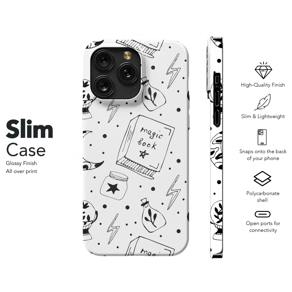 Embrace the enchanting world of witchcraft and celestial wonders with this mesmerizing mystical accessory, designed for the modern mystic and bohemian soul. Featuring a unique, hand-drawn doodle pattern in a striking black and white monochrome palette, this design is a beautiful celebration of all things magical and esoteric. Discover the intricate line art illustrations of a sacred magic book waiting to be opened, a fortune-telling crystal ball revealing a hidden sprig, a beautifully patterned crescent moon hanging in a dotted sky, potent elixir bottles, and jars filled with captured starlight. The entire scene is scattered with crackling lightning bolts, capturing a moment of powerful energy. The sketchbook-style art gives it an authentic, personal feel, perfect for anyone with an alternative, goth, or e-girl style, offering a touch of occult elegance to your everyday essentials. Crafted to be a durable yet lightweight and sleek guardian for your most-used handheld device, this protective covering shields your tech from the daily grind of scratches and accidental bumps without adding unnecessary bulk. It’s the perfect personal statement piece or a thoughtful birthday gift for the pagan, Wiccan, or astrology enthusiast in your life. This beautiful accessory transforms your everyday gadget into a personal grimoire, letting you carry a pocketful of cosmic magic wherever you go. It's an essential item for any modern witch's collection, blending whimsical charm with a dark, occult vibe for a unique look that protects your vital connection to the world.