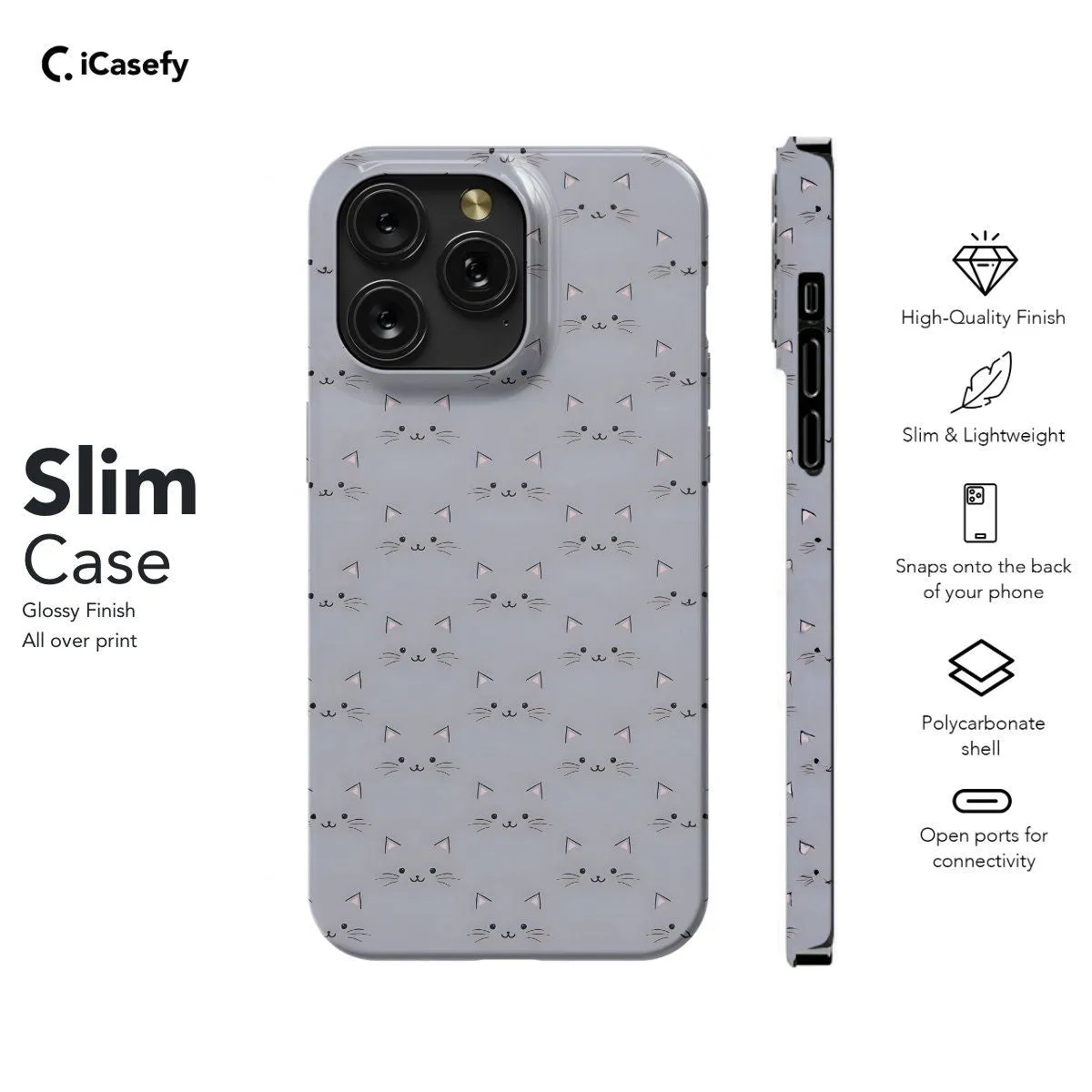 Elevate your style with our Minimalist Cat Face Pattern phone case. This sleek design features a minimalist interpretation of cat faces arranged in a captivating pattern, exuding simplicity and charm. Crafted for both style and protection, it offers precise cutouts for easy access to ports and buttons. Let this accessory showcase your love for feline friends with understated elegance.