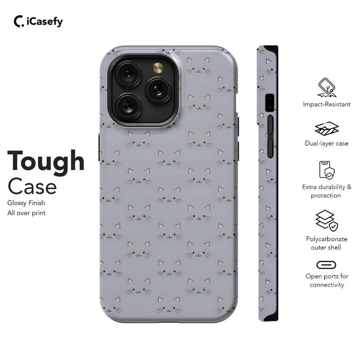 Elevate your style with our Minimalist Cat Face Pattern phone case. This sleek design features a minimalist interpretation of cat faces arranged in a captivating pattern, exuding simplicity and charm. Crafted for both style and protection, it offers precise cutouts for easy access to ports and buttons. Let this accessory showcase your love for feline friends with understated elegance.