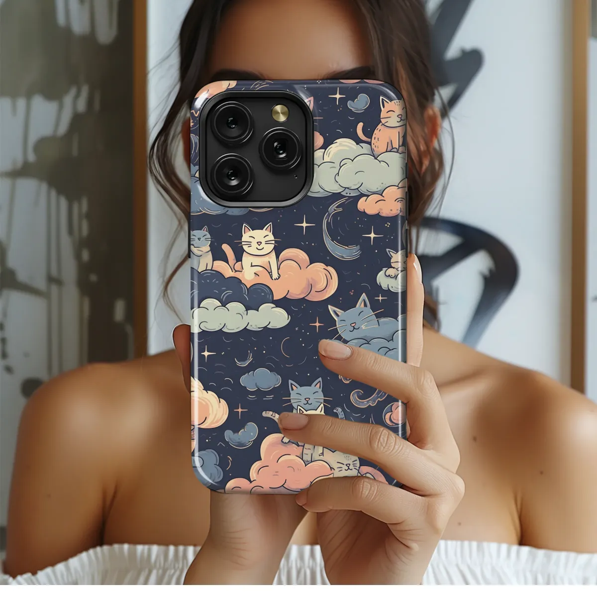 Adorn your device with this enchanting design featuring adorable cats nestled amongst dreamy clouds and twinkling stars. This whimsical artwork evokes a sense of peace and serenity, perfect for adding a touch of magic to your everyday life. The soft pastel color palette and charming illustrations create a captivating aesthetic that's both cute and sophisticated. This unique print is a delightful way to express your love for felines and celestial wonders, making it a great gift for cat lovers or anyone who appreciates beautiful, artistic designs. The high-quality printing ensures vibrant colors and long-lasting durability, guaranteeing your design will remain stunning for years to come. Bring a bit of the night sky and its purrfect inhabitants into your world with this captivating accessory. This design is sure to turn heads and spark conversations, ensuring you stand out from the crowd with a piece that perfectly reflects your personality and style. Its versatility makes it an ideal accessory for both everyday use and special occasions. Embrace the charm and add a touch of dreamy cuteness to your daily routine. Search terms: cute cats, cloud cats, stars, pastel, whimsical, galaxy, dreamy, kitty, feline, adorable, night sky, celestial, magical, unique, artistic, gift.