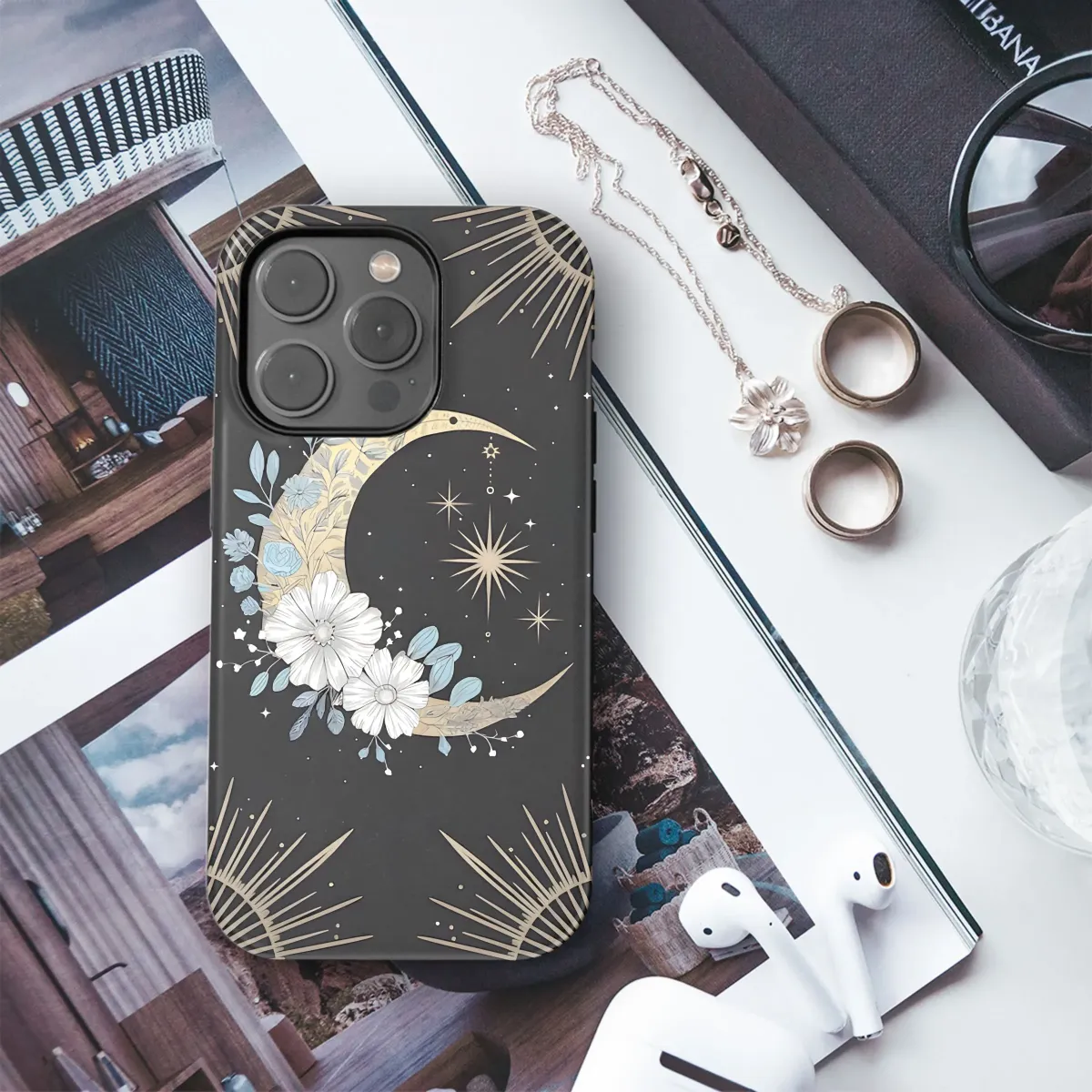 Embrace celestial beauty with this enchanting design featuring a gracefully curved moon adorned with a vibrant array of intricately drawn flowers and delicate foliage. Set against a deeply atmospheric backdrop reminiscent of a starlit night sky, the golden crescent holds a botanical secret garden, bursting with blossoms and leaves in soft hues. Glimmering stars dot the cosmic expanse, while radiant sunburst motifs frame the corners, adding a touch of vintage, celestial energy. This artwork merges the magic of the cosmos with the grounded beauty of nature, creating a mystical aesthetic that feels both dreamy and profound. It’s perfect for those who appreciate unique artistry, bohemian style, or a touch of witchy elegance. The detailed illustration captures the essence of moonlit nights and enchanted gardens, offering a constant reminder of the celestial dance and the abundance of the earth. This print is more than just a decorative piece; it's a wearable work of art, a statement accessory that reflects a love for the stars, the moon, and the natural world. Add a touch of cosmic wonder and botanical charm to your everyday item with this captivating image, an ideal way to express your unique personality and style. Its rich colors and intricate details make it a standout piece, bringing a touch of magic to your hands. This art print captures a serene, ethereal scene, ideal for anyone seeking a unique blend of cosmic and floral themes. The dark, moody background contrasts beautifully with the luminous crescent and the delicate blossoms, creating a visually stunning effect. A perfect accent for your daily essentials, offering a daily dose of celestial inspiration and garden tranquility. The design evokes feelings of mystery, wonder, and connection to the natural and cosmic realms. It’s a beautiful fusion of art and spirit, ready to adorn your favorite accessory.