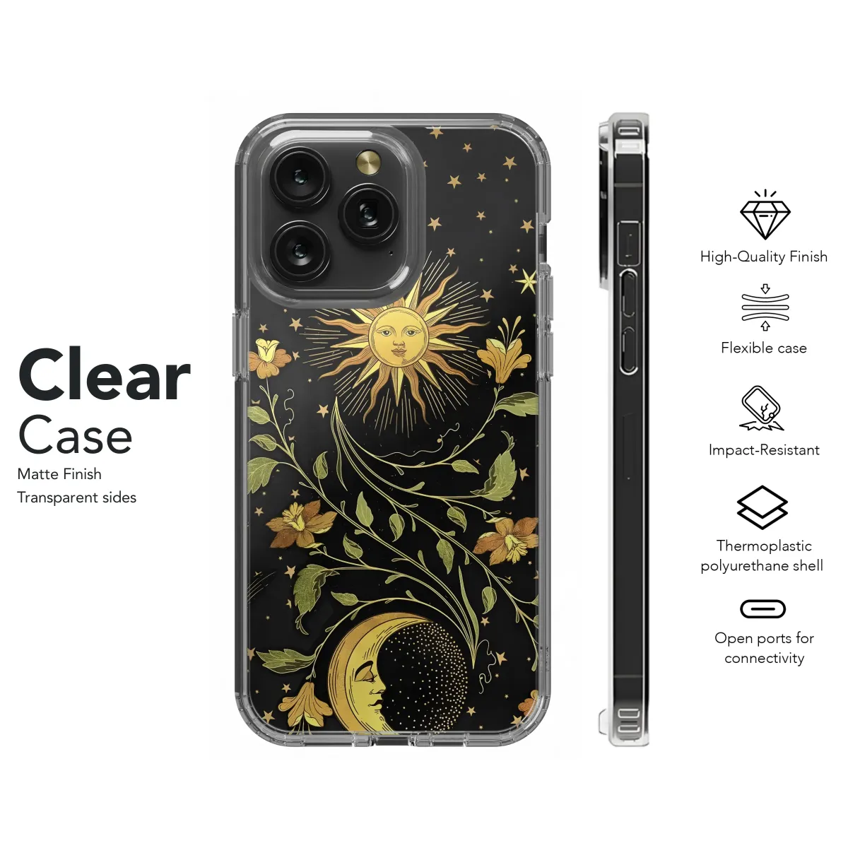 Embrace celestial beauty with this captivating design featuring a golden sun and moon adorned with delicate floral vines against a midnight black backdrop. The intricate details and rich gold accents create a luxurious, vintage aesthetic perfect for those who appreciate mystical and bohemian styles. This enchanting artwork evokes feelings of wonder and tranquility, making it a stunning addition to your personal style. The elegant, timeless design is digitally printed using high-quality inks for vibrant colors and lasting durability. It's a thoughtful self-gift or unique present for astrology enthusiasts, art lovers, or anyone drawn to the allure of the night sky. This piece effortlessly blends elegance and whimsy, transforming your everyday item into a work of art. Show your unique personality with this sophisticated and captivating accessory. Add a touch of magic to your world, order yours today! #celestial #sunandmoon #floral #vintage #bohemian #mystical #astrology #gold #black #night #stars #art #design #luxury #unique #gift #boho