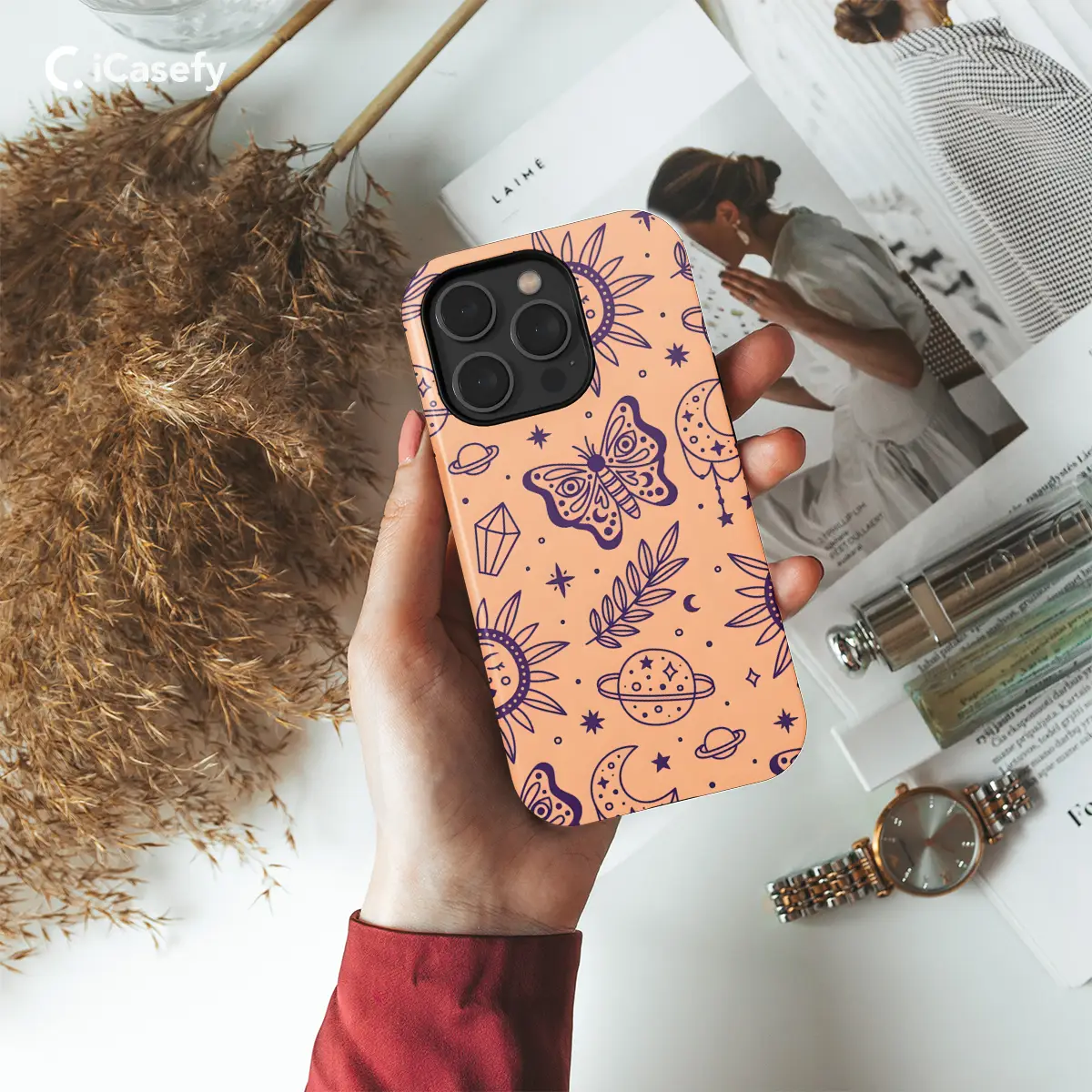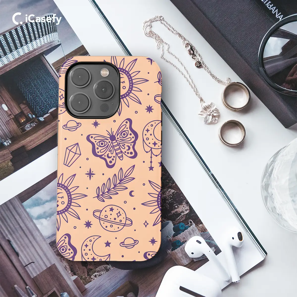 Immerse yourself in an ethereal celestial realm with this enchanting phone case. Adorned with intricate butterflies, sparkling stars, ethereal planets, and mysterious moons, it transports you to a cosmic tapestry. Its durable construction safeguards your device from the celestial unknown, while its vibrant hues and celestial charm elevate your style to the heavens. Embrace the magic of the cosmos, one celestial touch at a time.