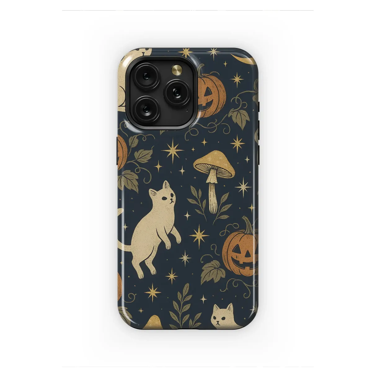 Step into a world where magic whispers on the autumn breeze, captured in this enchanting vintage-inspired design. Imagine a secret pumpkin patch that only comes alive after midnight, bathed in the soft glow of a golden crescent moon. Here, mischievous cream-colored cats with knowing eyes prowl and play under a star-dusted navy sky. Their whimsical figures dance between cheerful jack-o'-lanterns, whose carved smiles seem to share a delightful secret. Delicate vines twist and turn, while mysterious toadstools and botanical sprigs add a touch of earthy, folk art charm to the celestial scene. This artwork is a celebration of the spooky season, blending cozy cottagecore vibes with a touch of witchy enchantment. It's for the soul that feels most alive in the crisp autumn air, the cat lover who believes in a little magic, and the dreamer who gazes at the night sky in wonder. Carry this miniature masterpiece with you and let its starlit, Halloween spirit protect and personalize your most essential daily companion, turning a simple object into a portal of autumnal fantasy.