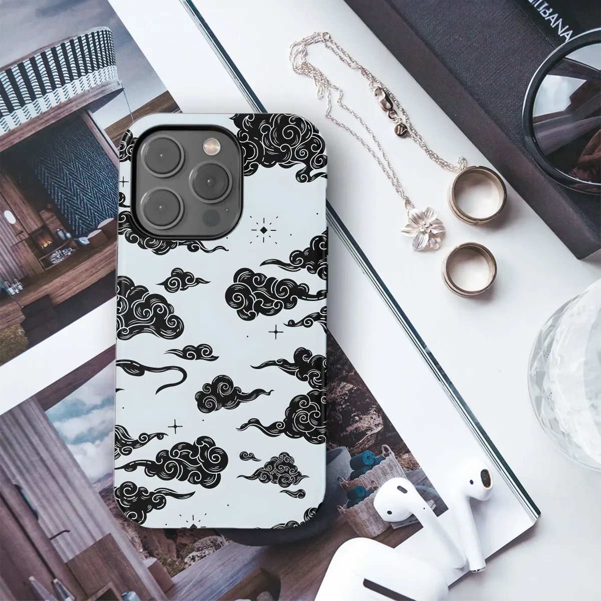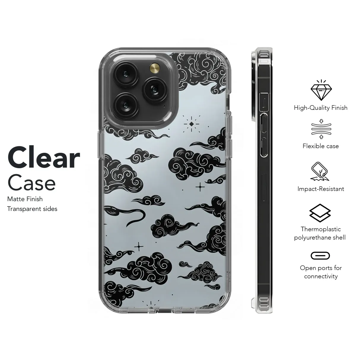 Dive into the mystical depths of the cosmos with this enchanting design, a breathtaking portrayal of a moonlit night sky that evokes wonder and intrigue. Dominating the scene is a radiant crescent moon, its soft, white glow a striking beacon against the serene, light blue expanse. Around it gather a multitude of intensely stylized, dark black clouds. These aren't just ordinary clouds; their swirling forms and intricate lines possess a distinct artistic flair, reminiscent of ancient woodblock prints or intricate tattoo art, blending elements of oriental aesthetics with a touch of dark, dreamy fantasy. The dense, curling shapes of the vapor provide a dramatic contrast to the ethereal light. Scattered amongst this celestial panorama are delicate pinpricks of light and stylized starbursts, adding a layer of sparkle like distant galaxies or guiding stars across the quiet universe. This graphic creates a captivating atmosphere – part tranquil night, part dramatic celestial event – making it an ideal visual narrative for anyone drawn to the mystery of the heavens, lunar cycles, gothic art, or seeking to infuse their personal style with a unique, alternative edge. The striking contrast between the stark black forms and the luminous moon, set against the calming background, offers a sophisticated yet mystical appeal. This versatile pattern is more than just a print; it's a piece of wearable art that connects you to the cosmic dance above, embodying a spirit of wonder and dark romance. Elevate your aesthetic with this stunning, unique depiction of a magical night sky, designed for those who carry the universe with them and appreciate deeply atmospheric, symbolic artwork.