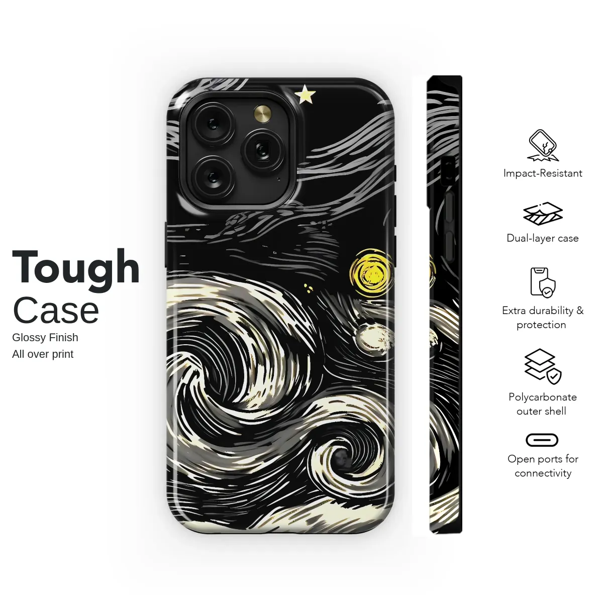 Carry a masterpiece in the palm of your hand and wrap your most essential companion in the swirling, dreamlike energy of the cosmos. Inspired by Van Gogh's iconic vision, this design reimagines the famous Starry Night with the bold, textural feel of a classic woodcut print. Luminous golden stars and a glowing moon burst from an inky black sky, while expressive, hand-carved-style currents of silver-grey clouds dance with dramatic, celestial motion. Below the vibrant heavens, a quiet village sleeps, grounding the ethereal scene with a touch of peaceful, earthly charm. This artistic accessory is a perfect statement piece for the art history lover, the romantic dreamer, or anyone with a dark academia or witchy soul who finds magic in the midnight hour. It’s more than just a beautiful image; it's a pocketful of starlight, a unique and thoughtful gift that transforms an everyday object into a conversation-starting piece of wearable art. Let your personal style shine as brightly as the constellations and carry a touch of timeless, expressive beauty with you wherever you wander.
