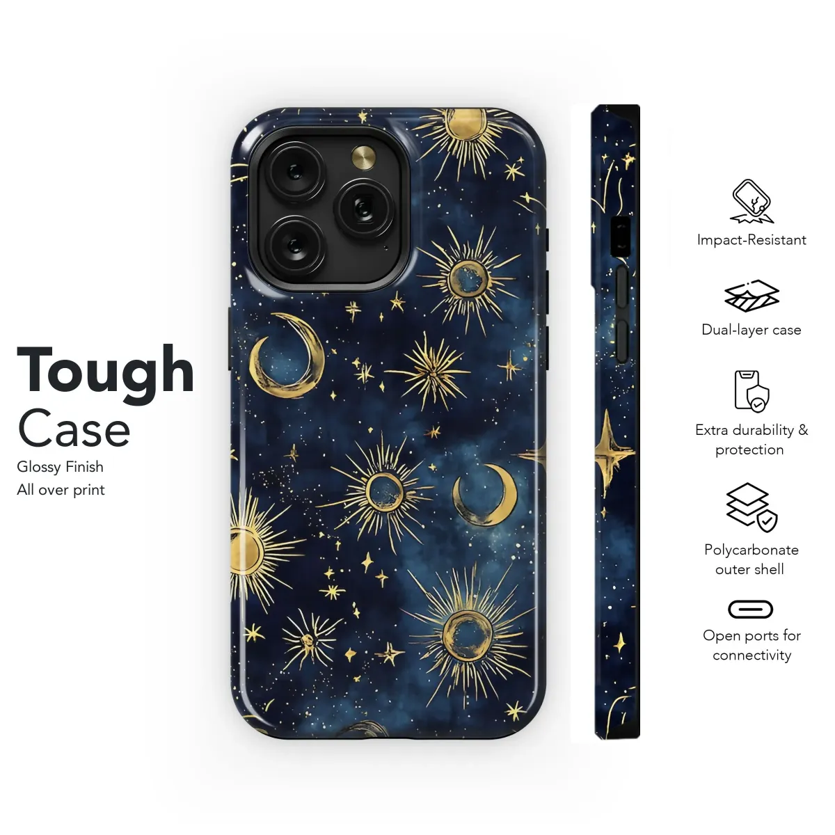 Adorn your device with this celestial wonder! Featuring a mesmerizing design of radiant golden suns, crescent moons, and twinkling stars scattered across a deep indigo cosmic backdrop, this artwork evokes a sense of magic and wonder. The rich, contrasting colors and intricate details create a captivating visual experience, perfect for those who are drawn to astrology, astronomy, and the mysteries of the universe. Express your unique style with this eye-catching design, ideal for stargazers, dreamers, and anyone who appreciates beautiful, artistic creations. Let the cosmos inspire you every day with this stunning piece that combines modern aesthetics with timeless celestial motifs. Embrace your inner celestial being with this unique and stylish celestial design. Get your astrology moon stars artwork now, it also is a perfect astrology lovers gift.