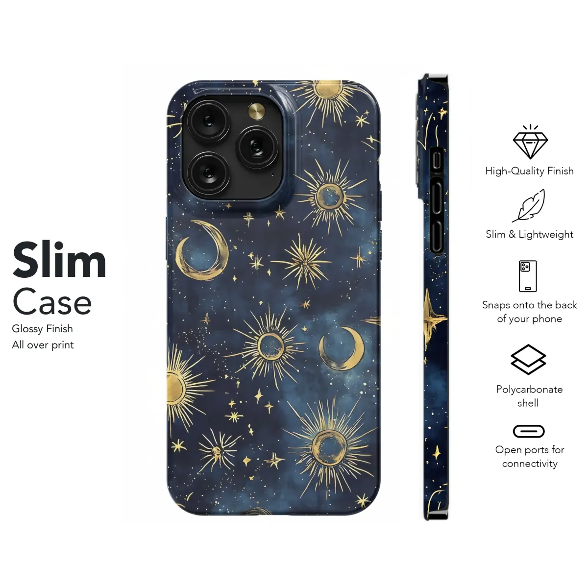 Adorn your device with this celestial wonder! Featuring a mesmerizing design of radiant golden suns, crescent moons, and twinkling stars scattered across a deep indigo cosmic backdrop, this artwork evokes a sense of magic and wonder. The rich, contrasting colors and intricate details create a captivating visual experience, perfect for those who are drawn to astrology, astronomy, and the mysteries of the universe. Express your unique style with this eye-catching design, ideal for stargazers, dreamers, and anyone who appreciates beautiful, artistic creations. Let the cosmos inspire you every day with this stunning piece that combines modern aesthetics with timeless celestial motifs. Embrace your inner celestial being with this unique and stylish celestial design. Get your astrology moon stars artwork now, it also is a perfect astrology lovers gift.