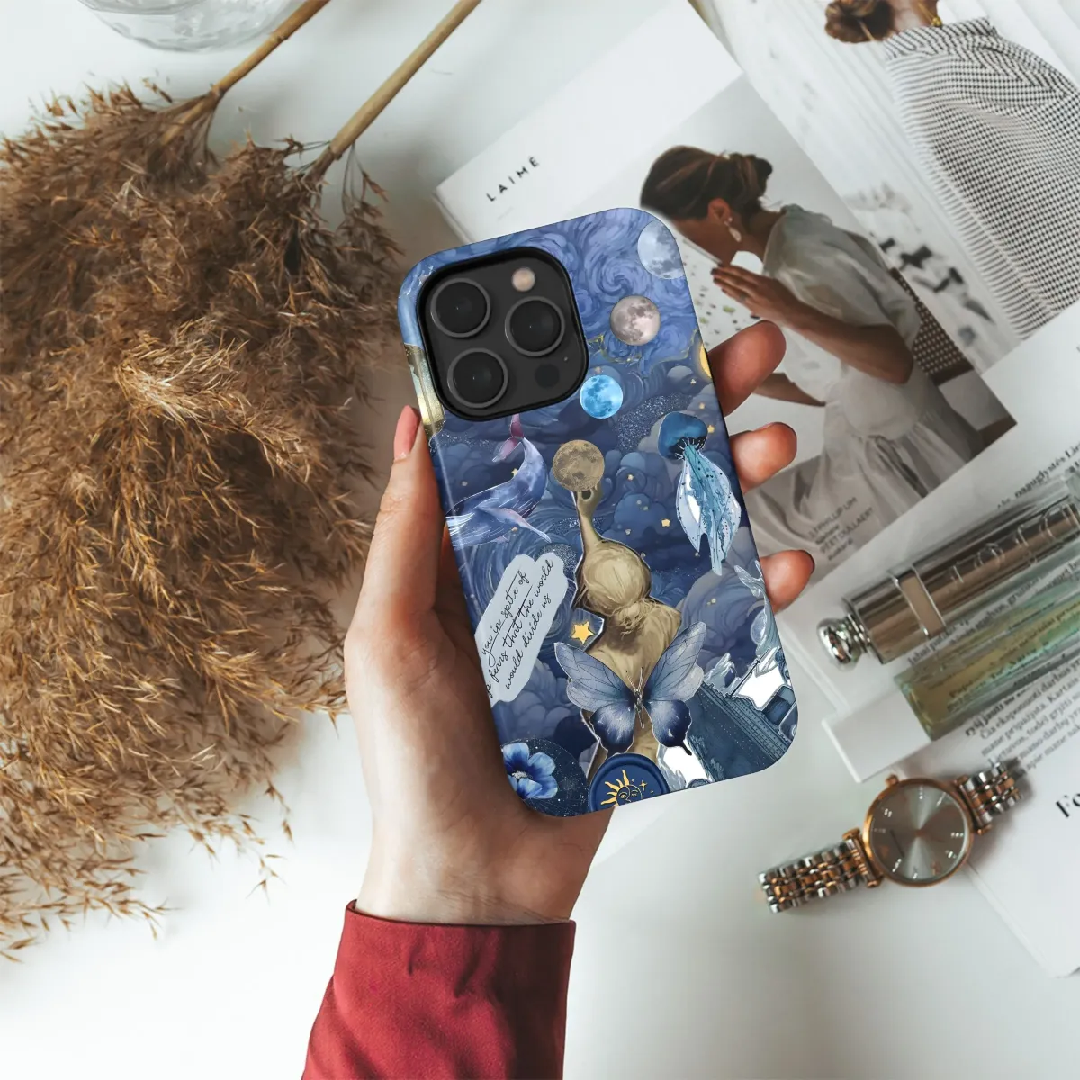 Immerse yourself in the celestial beauty of this dreamy art design, perfect for adding a touch of whimsical elegance to your everyday tech. A swirling Van Gogh-esque sky provides the backdrop for a captivating scene featuring graceful whales dancing among the stars and various phases of the moon. A glowing lantern and ethereal jellyfish add a mystical touch, while a delicate butterfly and poetic quote whisper of love and resilience. A statue holding the moon serves as a focal point, grounding the fantastical elements with a touch of classic art. A blue poppy and sun and moon symbol add further delightful detail, juxtaposed with an image of the titanic, it's all creating a symphony of color and emotion. Ideal for those who appreciate unique art and celestial themes, this design is sure to make a statement. Elevate your gadget with this stunning celestial artwork! Perfect for lovers of dreamy aesthetics, art, astronomy gifts, moon lovers, whimsical prints, and unique accessory designs.
