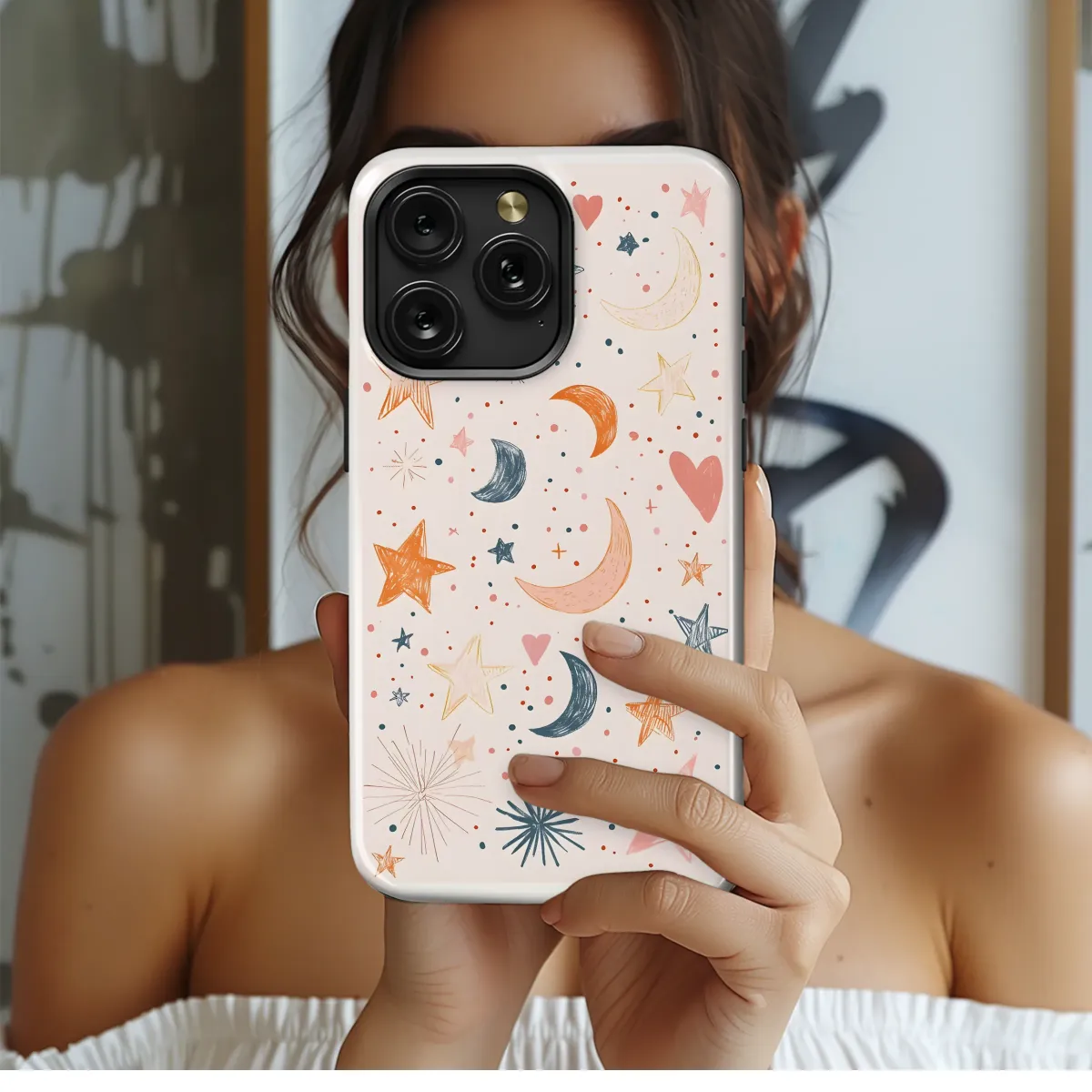 Embrace the celestial charm of this dreamy design, featuring hand-drawn stars, moons, and hearts scattered across a soft blush background. The whimsical, textured style adds a touch of boho elegance, perfect for adding a unique and stylish touch to your everyday life. This captivating pattern boasts a delightful mix of warm terracotta, soft blush pink, and cool navy hues, creating a visually appealing and calming aesthetic. Each element is meticulously crafted, resulting in a design that is both artistic and effortlessly chic. The subtle color palette ensures this design complements a variety of personal styles, from minimalist to maximalist. This versatile artwork transforms any accessory into a statement piece, showcasing your love for unique and expressive designs. Bring a touch of stardust into your world with this enchanting piece, a perfect blend of artistic expression and everyday practicality. Add a celestial glow to your personal style with this beautifully designed item, guaranteed to turn heads and spark conversation. Its unique and charming aesthetic makes it an ideal gift for those with a passion for all things celestial and beautiful.