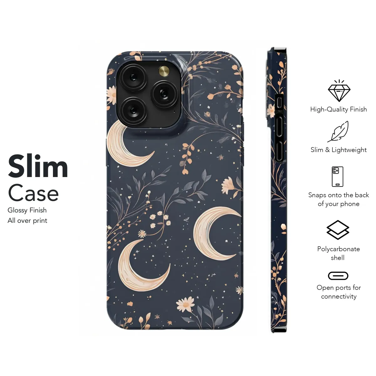 Embrace the celestial charm with this enchanting mystical design! This captivating artwork features crescent moons nestled among delicate floral vines and twinkling stars, set against a deep midnight blue backdrop. The intricate details and elegant composition create a sense of magic and wonder, perfect for adding a touch of bohemian flair to your everyday accessories. Ideal for those who love astrology, moon phases, or simply appreciate beautiful botanical art, this design is sure to turn heads. Let this starry night bloom grace your belongings with its ethereal beauty. Great for celestial lovers, astrology enthusiasts, and anyone who seeks a touch of magic in their lives. It will protect your device with an artistic charm and aesthetic appeal. Perfect for gifts and personal use.