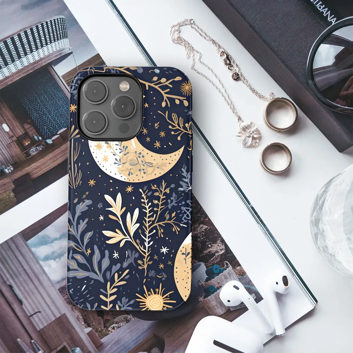 Embrace celestial charm with this captivating mystical design! Perfect for adding a touch of whimsical elegance to your everyday items, this pattern features a mesmerizing arrangement of crescent moons, radiant suns, sparkling stars, and enchanting botanicals. The color palette of muted golds, deep blues, and contrasting white creates a sophisticated and dreamy aesthetic. Whether you're a stargazer, a nature lover, or simply appreciate unique artistry, this design is sure to turn heads and spark conversation. Ideal for personalized accessories, this print brings a touch of the cosmos to your fingertips. Let the night sky inspire your style with this celestial wonder, a perfect blend of modern design and timeless beauty. Discover a touch of magic with this charming lunar, floral, and solar inspired artwork.