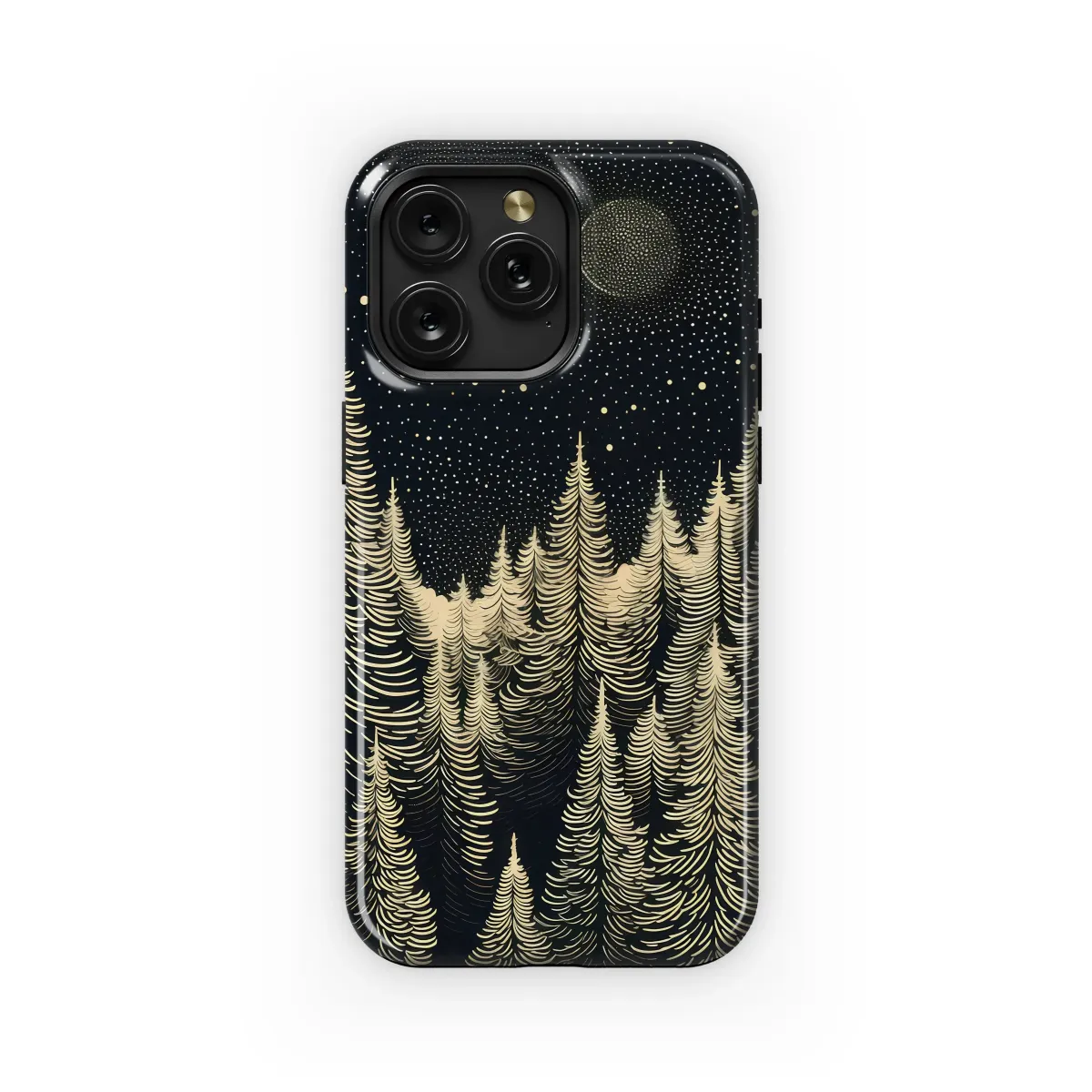 Lose yourself in the profound quiet of a celestial wilderness with this captivating design. Imagine standing at the edge of a dense pine forest, the crisp night air cool against your skin, looking up as a million stars sprinkle across the inky black sky like celestial dust. A glowing, stippled moon hangs like an ancient lantern, casting an ethereal light upon the rolling sea of treetops, illuminating each delicate needle in a soft, creamy gold. This intricate, woodcut-style artwork captures the magical stillness of a winter's night, evoking a sense of peaceful solitude, deep connection, and cosmic wonder. The stark contrast between the velvety dark background and the luminous, linear details creates a visually stunning piece that feels both classic and mystical, perfect for a boho or witchy aesthetic. It’s a portal to a tranquil world, a secret woodland scene designed for the dreamer, the stargazer, and the soul who finds solace in the deep woods. This beautiful nature-inspired art makes a perfect unique gift for a fellow nature lover, or as a personal talisman to connect with the quiet magic of the universe. Let this design be a statement of your love for the cosmos and the wild. An ode to the silent beauty of the woods after dark, it’s more than just an accessory; it's a piece of wearable art. Carry this slice of the enchanted forest with you wherever you go and let its serene energy transform your everyday moments into something extraordinary, a constant reminder of the profound beauty that thrives in the darkness.