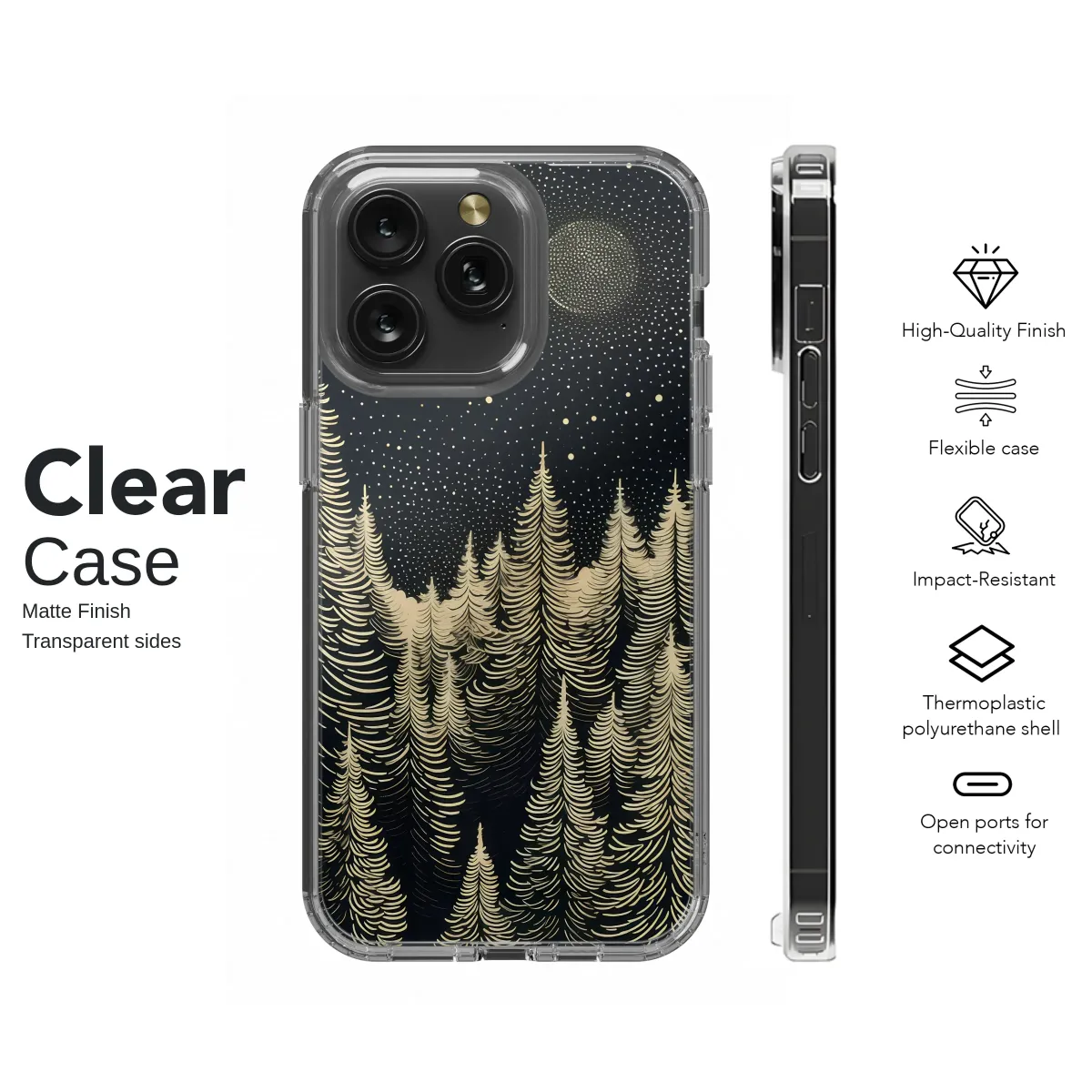 Lose yourself in the profound quiet of a celestial wilderness with this captivating design. Imagine standing at the edge of a dense pine forest, the crisp night air cool against your skin, looking up as a million stars sprinkle across the inky black sky like celestial dust. A glowing, stippled moon hangs like an ancient lantern, casting an ethereal light upon the rolling sea of treetops, illuminating each delicate needle in a soft, creamy gold. This intricate, woodcut-style artwork captures the magical stillness of a winter's night, evoking a sense of peaceful solitude, deep connection, and cosmic wonder. The stark contrast between the velvety dark background and the luminous, linear details creates a visually stunning piece that feels both classic and mystical, perfect for a boho or witchy aesthetic. It’s a portal to a tranquil world, a secret woodland scene designed for the dreamer, the stargazer, and the soul who finds solace in the deep woods. This beautiful nature-inspired art makes a perfect unique gift for a fellow nature lover, or as a personal talisman to connect with the quiet magic of the universe. Let this design be a statement of your love for the cosmos and the wild. An ode to the silent beauty of the woods after dark, it’s more than just an accessory; it's a piece of wearable art. Carry this slice of the enchanted forest with you wherever you go and let its serene energy transform your everyday moments into something extraordinary, a constant reminder of the profound beauty that thrives in the darkness.