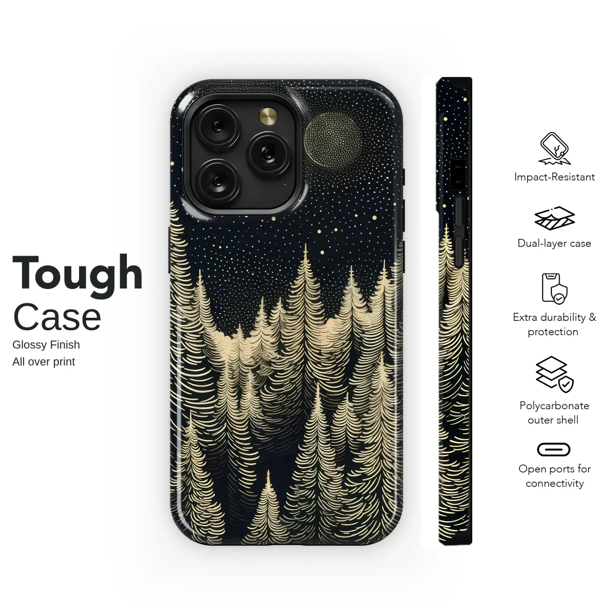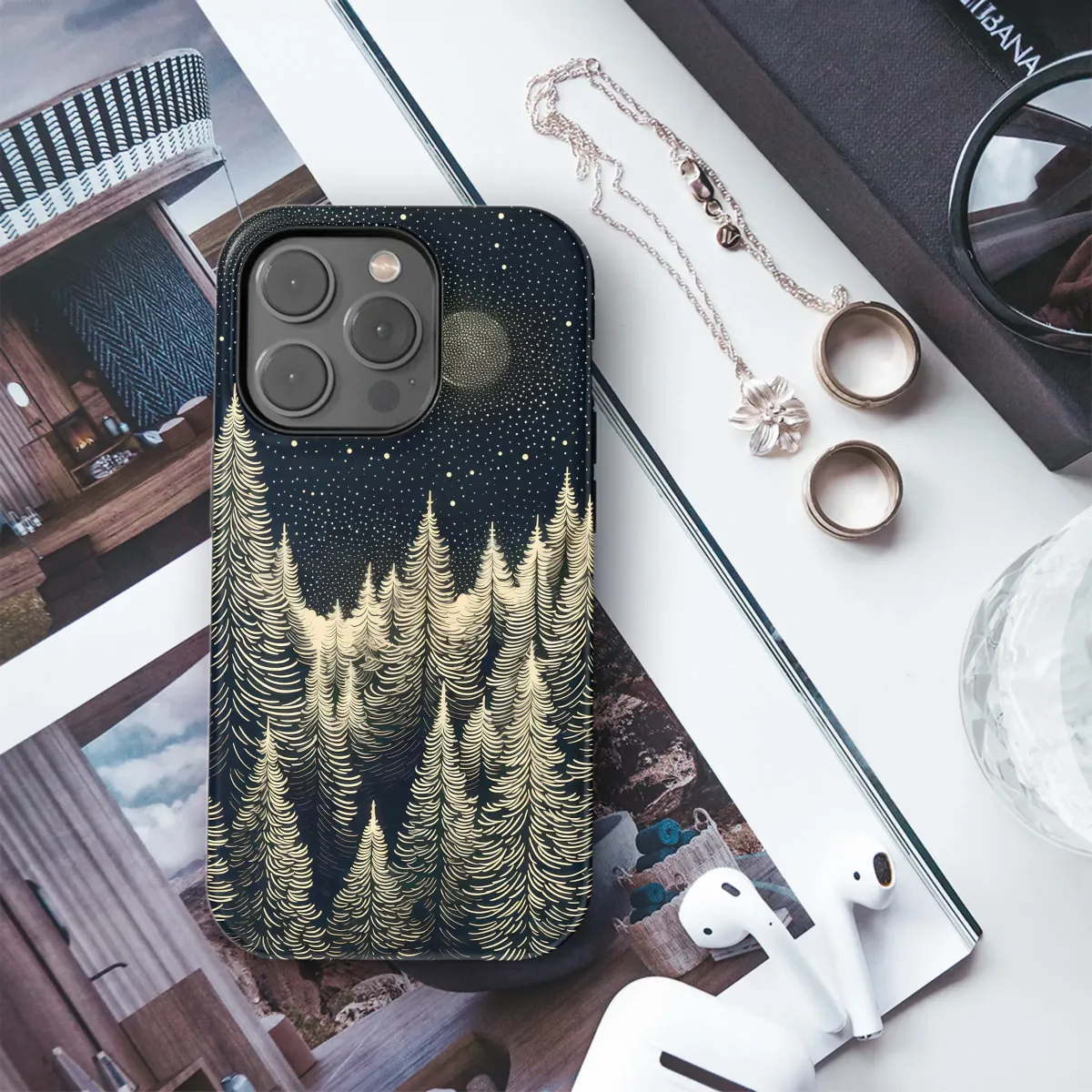 Lose yourself in the profound quiet of a celestial wilderness with this captivating design. Imagine standing at the edge of a dense pine forest, the crisp night air cool against your skin, looking up as a million stars sprinkle across the inky black sky like celestial dust. A glowing, stippled moon hangs like an ancient lantern, casting an ethereal light upon the rolling sea of treetops, illuminating each delicate needle in a soft, creamy gold. This intricate, woodcut-style artwork captures the magical stillness of a winter's night, evoking a sense of peaceful solitude, deep connection, and cosmic wonder. The stark contrast between the velvety dark background and the luminous, linear details creates a visually stunning piece that feels both classic and mystical, perfect for a boho or witchy aesthetic. It’s a portal to a tranquil world, a secret woodland scene designed for the dreamer, the stargazer, and the soul who finds solace in the deep woods. This beautiful nature-inspired art makes a perfect unique gift for a fellow nature lover, or as a personal talisman to connect with the quiet magic of the universe. Let this design be a statement of your love for the cosmos and the wild. An ode to the silent beauty of the woods after dark, it’s more than just an accessory; it's a piece of wearable art. Carry this slice of the enchanted forest with you wherever you go and let its serene energy transform your everyday moments into something extraordinary, a constant reminder of the profound beauty that thrives in the darkness.