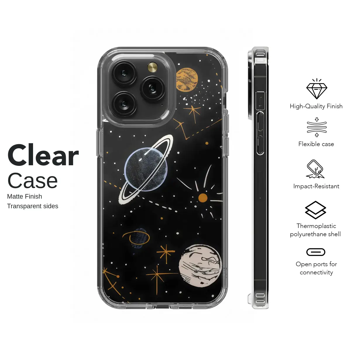 Protect your phone with this unique celestial galaxy case, featuring a hand-drawn pattern of planets, stars, and constellations. This cosmic phone cover adds a touch of whimsical, astronomical style to your device, perfect for any stargazer or astrology lover. Inspired by vintage astronomy charts and starry night skies, our design brings the wonder of the cosmos to your daily life. The intricate black, white, and gold illustration captures the magic of a sprawling galaxy in a unique, sketchy art style. Key Features: • Durable Protection: Made from a high-quality, flexible TPU material that guards against drops, scratches, and dust. • High-Quality Print: The detailed celestial design is UV-printed for a vibrant, long-lasting finish that resists fading and wear. • Slim & Lightweight: Offers robust protection without adding unnecessary bulk to your phone. • Precise Fit: Available for a wide range of models including iPhone 15, 14, 13, 12, Samsung Galaxy S23, S22, and Google Pixel 8. Please select your device from the dropdown menu. Care Instructions: To clean, simply wipe with a soft, damp cloth.