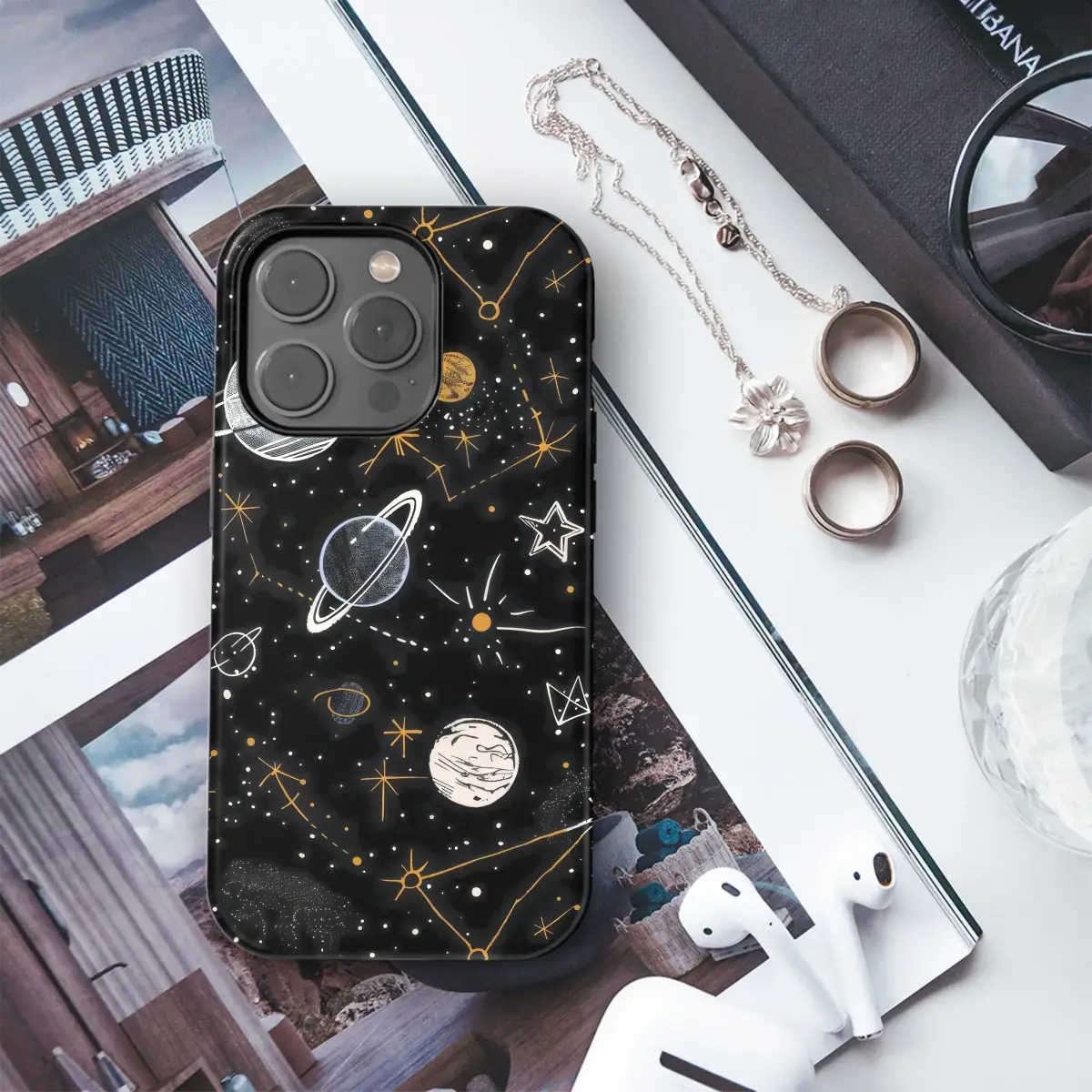 Protect your phone with this unique celestial galaxy case, featuring a hand-drawn pattern of planets, stars, and constellations. This cosmic phone cover adds a touch of whimsical, astronomical style to your device, perfect for any stargazer or astrology lover. Inspired by vintage astronomy charts and starry night skies, our design brings the wonder of the cosmos to your daily life. The intricate black, white, and gold illustration captures the magic of a sprawling galaxy in a unique, sketchy art style. Key Features: • Durable Protection: Made from a high-quality, flexible TPU material that guards against drops, scratches, and dust. • High-Quality Print: The detailed celestial design is UV-printed for a vibrant, long-lasting finish that resists fading and wear. • Slim & Lightweight: Offers robust protection without adding unnecessary bulk to your phone. • Precise Fit: Available for a wide range of models including iPhone 15, 14, 13, 12, Samsung Galaxy S23, S22, and Google Pixel 8. Please select your device from the dropdown menu. Care Instructions: To clean, simply wipe with a soft, damp cloth.