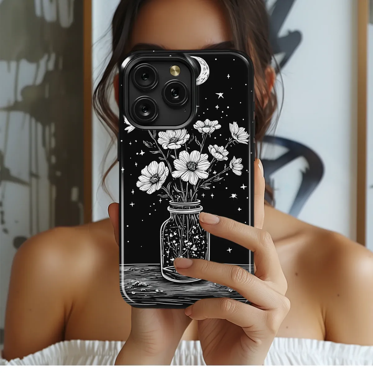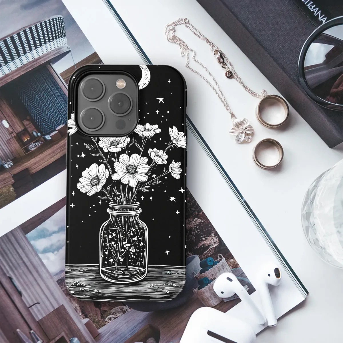 Embrace the quiet magic of a midnight garden with this enchanting celestial art, a perfect touch of witchy charm for your everyday essentials. Imagine a still, ink-black night, where wild cosmos and delicate wildflowers bloom in stark, beautiful white, reaching for a sky scattered with twinkling stars and a serene crescent moon. This captivating botanical illustration captures a fleeting moment of peace, with the starlit bouquet gathered in a rustic glass jar that seems to hold a tiny galaxy within its waters. The striking black and white, reminiscent of a classic linocut or woodblock print, creates a moody, gothic floral aesthetic that will speak to your soul. It’s a design for the dreamer, the stargazer, and the lover of dark cottagecore who finds beauty in the tranquil mysteries of the night. Let this whimsical piece of the cosmos be your daily companion, a constant reminder of the magic that flourishes in the dark. This nature-inspired artwork is a unique gift for any friend who loves celestial decor, mystical art, and carrying a little piece of enchantment with them wherever they go.