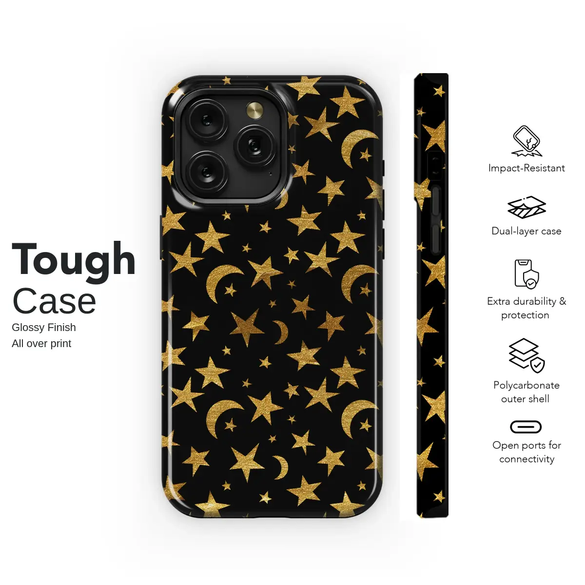 Embrace the magic of the cosmos with this enchanting celestial design. Featuring a dense pattern of shimmering gold stars and elegant crescent moons scattered across a deep black background, this artwork evokes the beauty of a clear night sky. The faux glitter texture on the golden elements adds a touch of sophisticated sparkle and depth, perfect for anyone who loves astrology, stargazing, or a whimsical aesthetic.