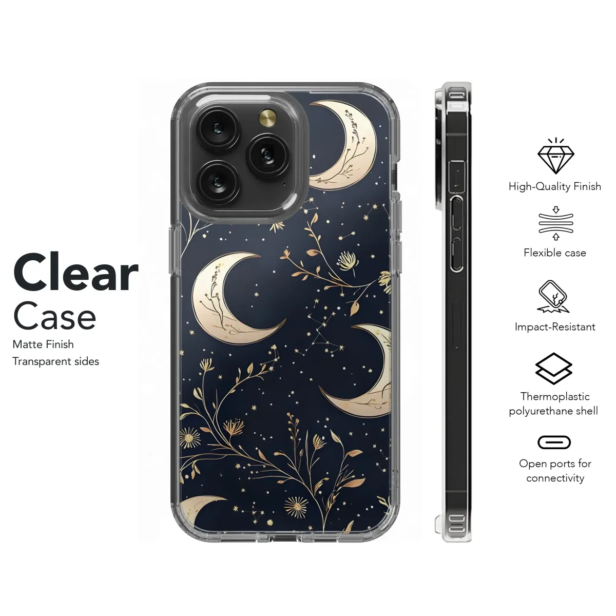 Immerse yourself in the ethereal beauty of the night with this captivating celestial botanical pattern. A deep, dark background, reminiscent of the midnight sky on a clear night, serves as the perfect canvas for a truly magical illustration. Scattered across this cosmic expanse are luminous golden crescent moons, their forms rendered in a rich, metallic-effect hue, each subtly adorned with delicate floral elements that seem to bloom directly from the lunar surface itself, blending celestial and earthly beauty in a stunning visual display. Intertwining gracefully with these shining celestial bodies are intricate golden branches and winding stems, featuring finely detailed leaves and whimsical flower buds that trail elegantly across the design, adding an organic, natural touch to the starry panorama. Tiny twinkling stars are sprinkled throughout the dark void, alongside the faint yet discernible outlines of classical constellations, visually connecting the earthly flora with the vastness and mystery of the cosmos above. This enchanting artwork seamlessly blends the timeless wonder of the night sky with the intricate, grounded beauty of nature, creating a captivating aesthetic perfect for those who cherish celestial themes, gothic elegance, witchy vibes, spiritual connection, or simply a touch of mystical bohemian charm in their everyday lives. It evokes a profound sense of wonder, conjures images of midnight gardens and cosmic dreams, and promotes a feeling of connection to both the universe above and the intricate life below. The rich contrast of the radiant golden elements against the deep, dark backdrop provides a sophisticated and visually striking presentation, making this pattern a truly unique artistic statement. This design offers a piece of portable art, bringing a touch of cosmic harmony, natural grace, and mystical allure into your daily existence, perfectly reflecting a love for astrology, fantasy, dark romance, and the timeless magic found in the heavens and on earth. It's a stunning illustration designed not just to be seen, but to inspire and enchant wherever you go.