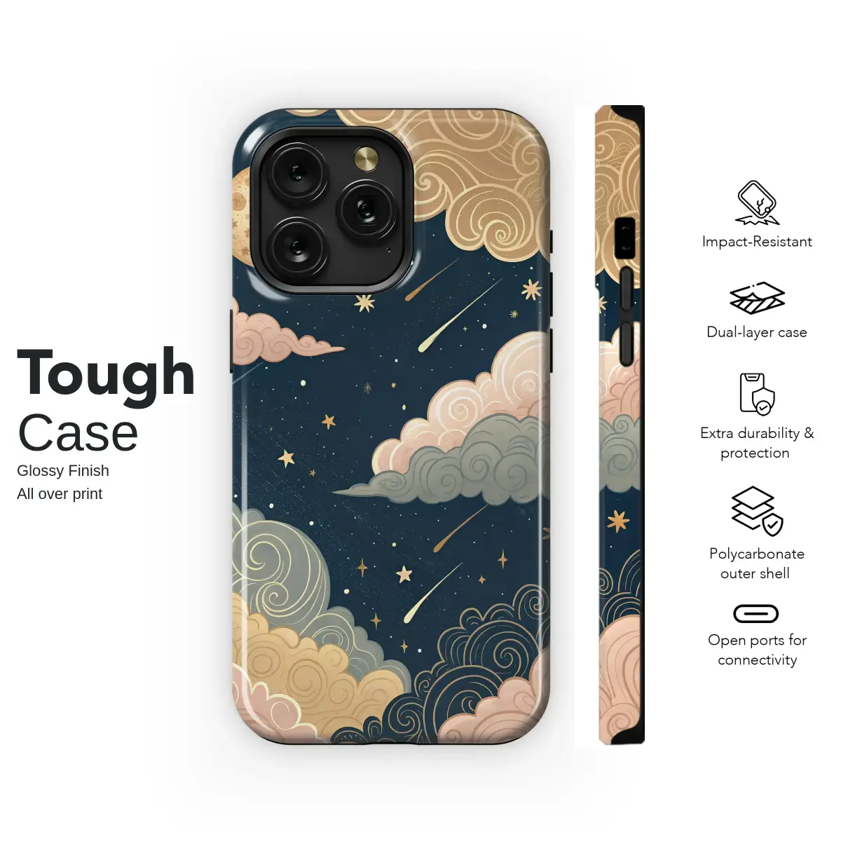 Immerse yourself in a dreamy celestial scene with this enchanting night sky design. A textured gold crescent moon hangs amidst a deep navy blue backdrop, dotted with sparkling stars and whimsical shooting stars. The sky is filled with beautifully stylized, swirling clouds in shades of gold, soft pink, and gentle grey, creating a magical and serene atmosphere.