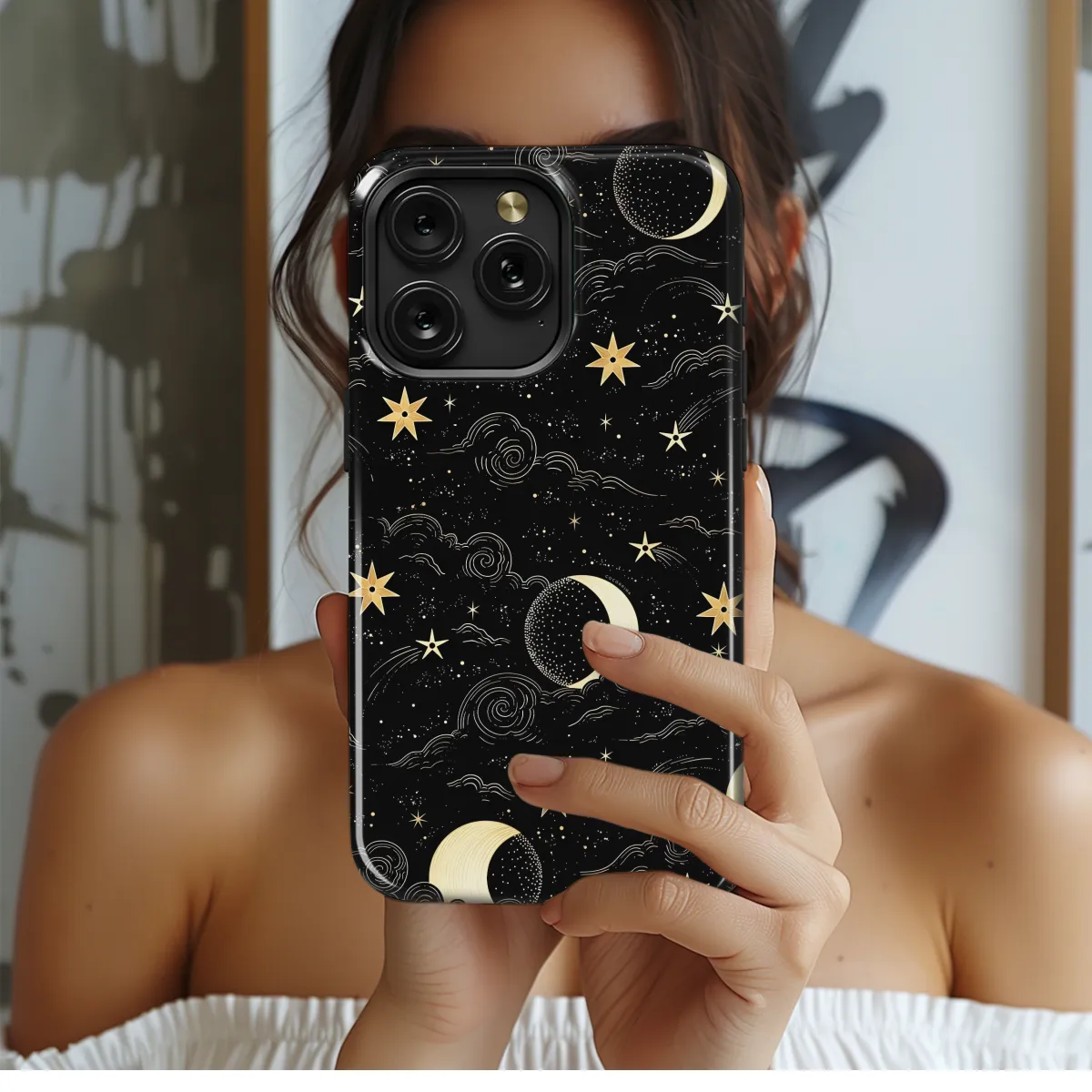 Experience the celestial beauty of the cosmos with our Celestial Gold Night Phone Case. Its shimmering gold design adorned with intricate celestial motifs evokes the ethereal glow of a starlit sky. Crafted with premium-grade materials, this case provides exceptional protection against bumps, scratches, and everyday wear and tear, ensuring your device remains safe and stylish. The slim profile and precise cutouts ensure a seamless fit and easy access to all ports and buttons.