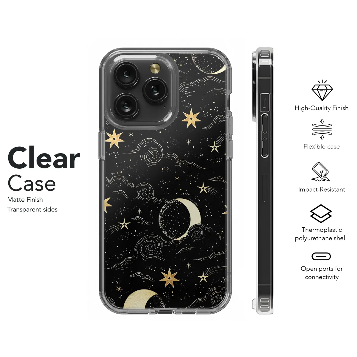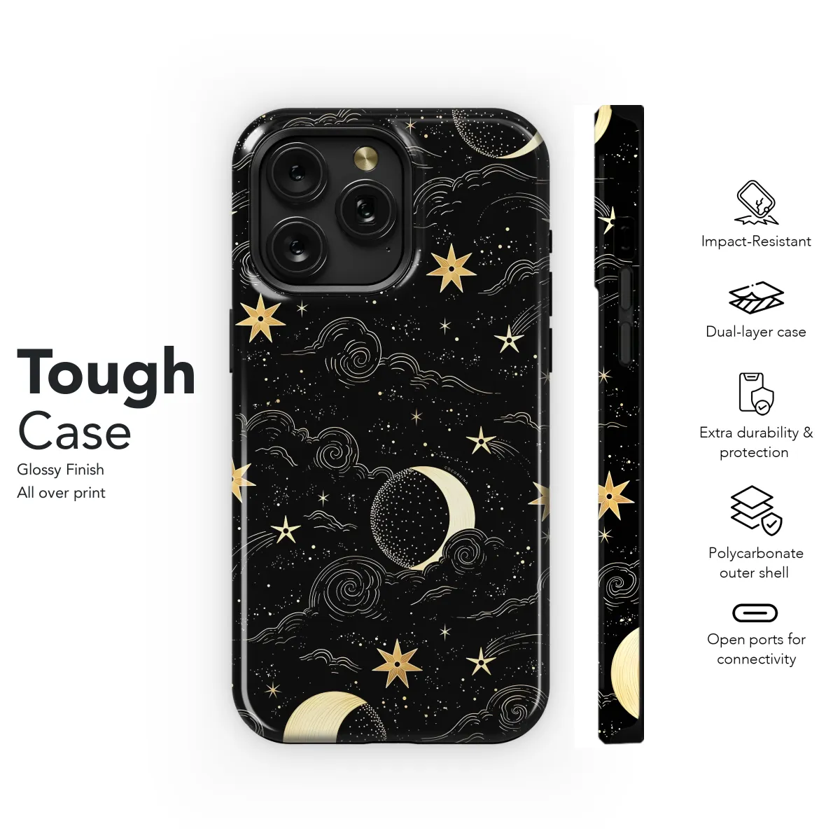 Experience the celestial beauty of the cosmos with our Celestial Gold Night Phone Case. Its shimmering gold design adorned with intricate celestial motifs evokes the ethereal glow of a starlit sky. Crafted with premium-grade materials, this case provides exceptional protection against bumps, scratches, and everyday wear and tear, ensuring your device remains safe and stylish. The slim profile and precise cutouts ensure a seamless fit and easy access to all ports and buttons.