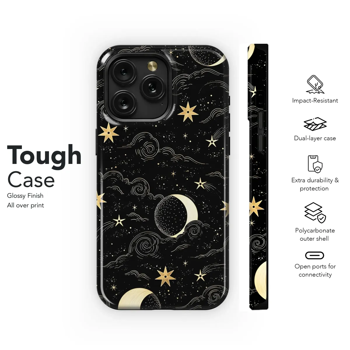 Embrace the celestial with this enchanting design, featuring a mesmerizing pattern of crescent moons and sparkling stars set against a midnight black backdrop. The elegant gold detailing adds a touch of luxury, transforming your device into a captivating piece of wearable art. This cosmic print is perfect for those who appreciate mystical aesthetics and unique style. Its timeless appeal makes it a versatile accessory suitable for everyday use or special occasions. The intricate artwork is printed with high-quality inks to ensure vibrant, long-lasting color and clarity, protecting your device while showcasing your stellar taste. This design is a conversation starter, a subtle yet striking statement, and an expression of your celestial spirit. Add a touch of magic to your everyday life. This artwork is perfect for adding a touch of celestial magic to your personal style, making a statement without saying a word. The exquisite detail and striking contrast make this a truly unique and unforgettable design. Show off your cosmic side with this captivating accessory. #celestial #moon #stars #gold #black #mystical #astrology #space #cosmic #boho #magical #design #art #unique #fashion #accessories #statementpiece