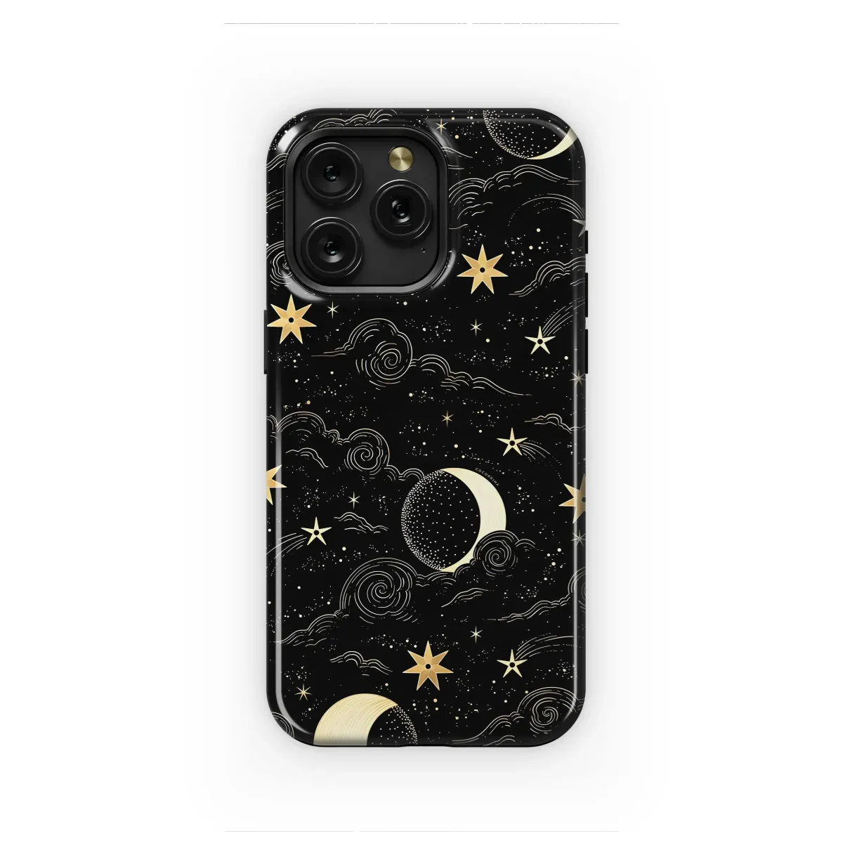 Embrace the celestial with this enchanting design, featuring a mesmerizing pattern of crescent moons and sparkling stars set against a midnight black backdrop. The elegant gold detailing adds a touch of luxury, transforming your device into a captivating piece of wearable art. This cosmic print is perfect for those who appreciate mystical aesthetics and unique style. Its timeless appeal makes it a versatile accessory suitable for everyday use or special occasions. The intricate artwork is printed with high-quality inks to ensure vibrant, long-lasting color and clarity, protecting your device while showcasing your stellar taste. This design is a conversation starter, a subtle yet striking statement, and an expression of your celestial spirit. Add a touch of magic to your everyday life. This artwork is perfect for adding a touch of celestial magic to your personal style, making a statement without saying a word. The exquisite detail and striking contrast make this a truly unique and unforgettable design. Show off your cosmic side with this captivating accessory. #celestial #moon #stars #gold #black #mystical #astrology #space #cosmic #boho #magical #design #art #unique #fashion #accessories #statementpiece