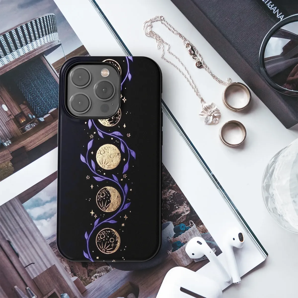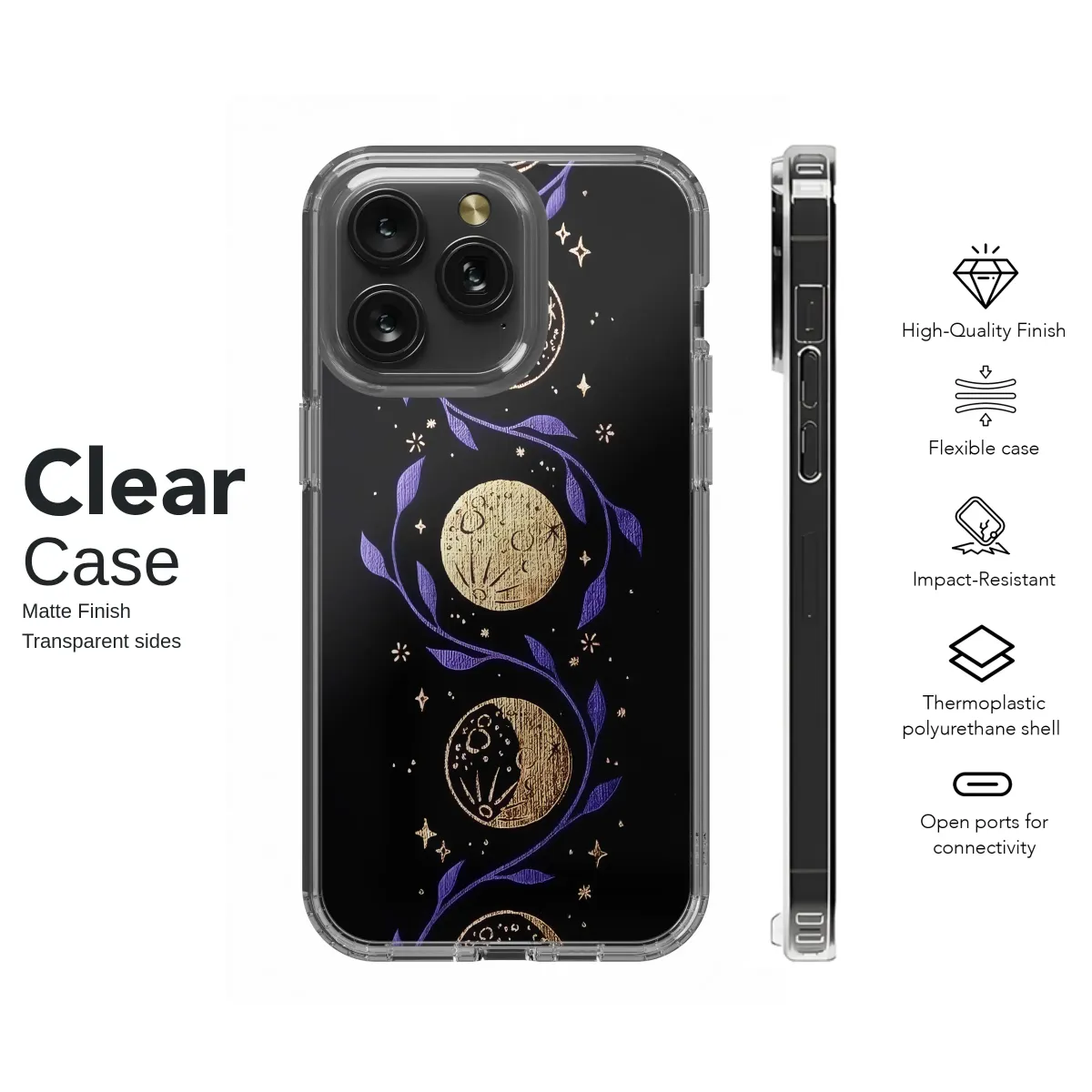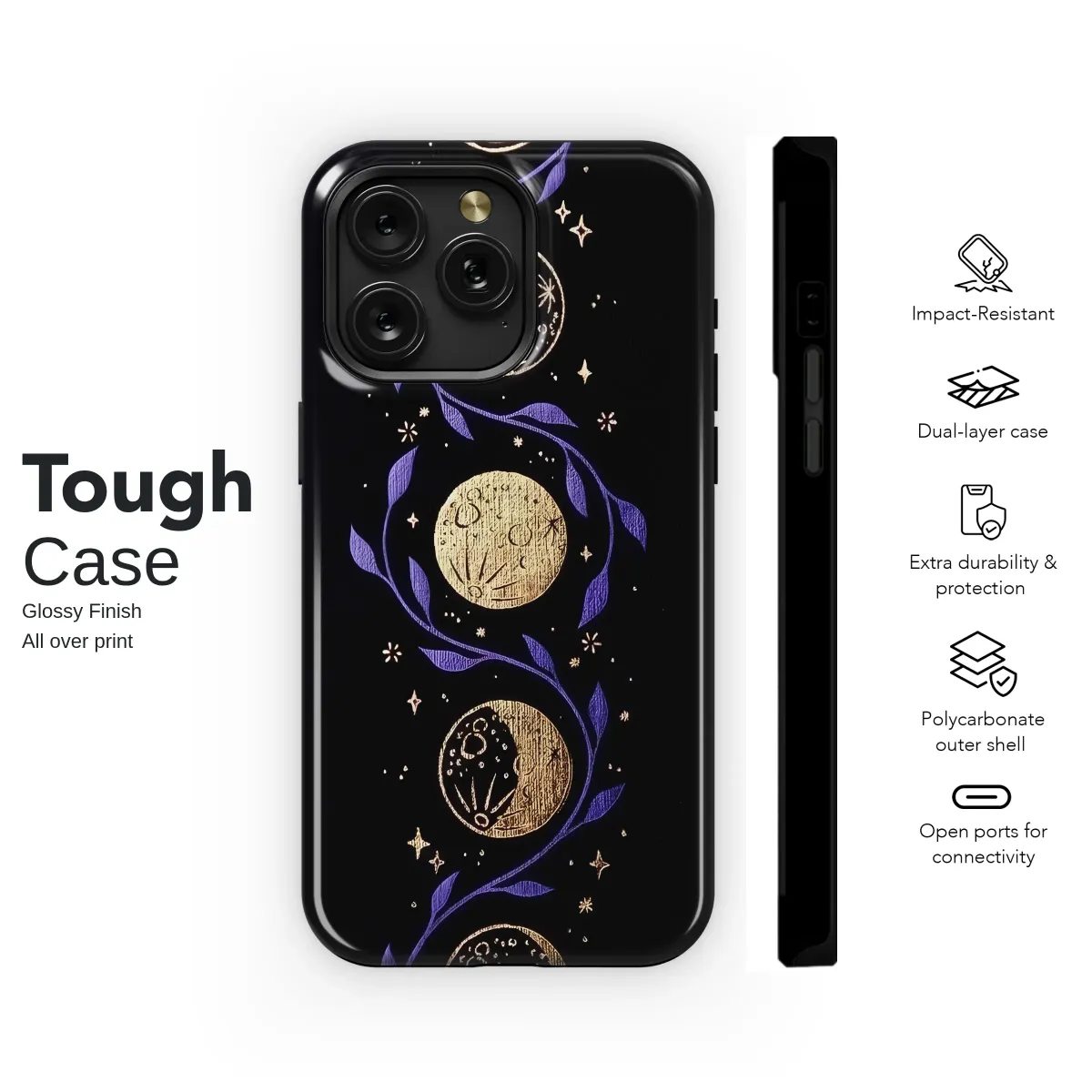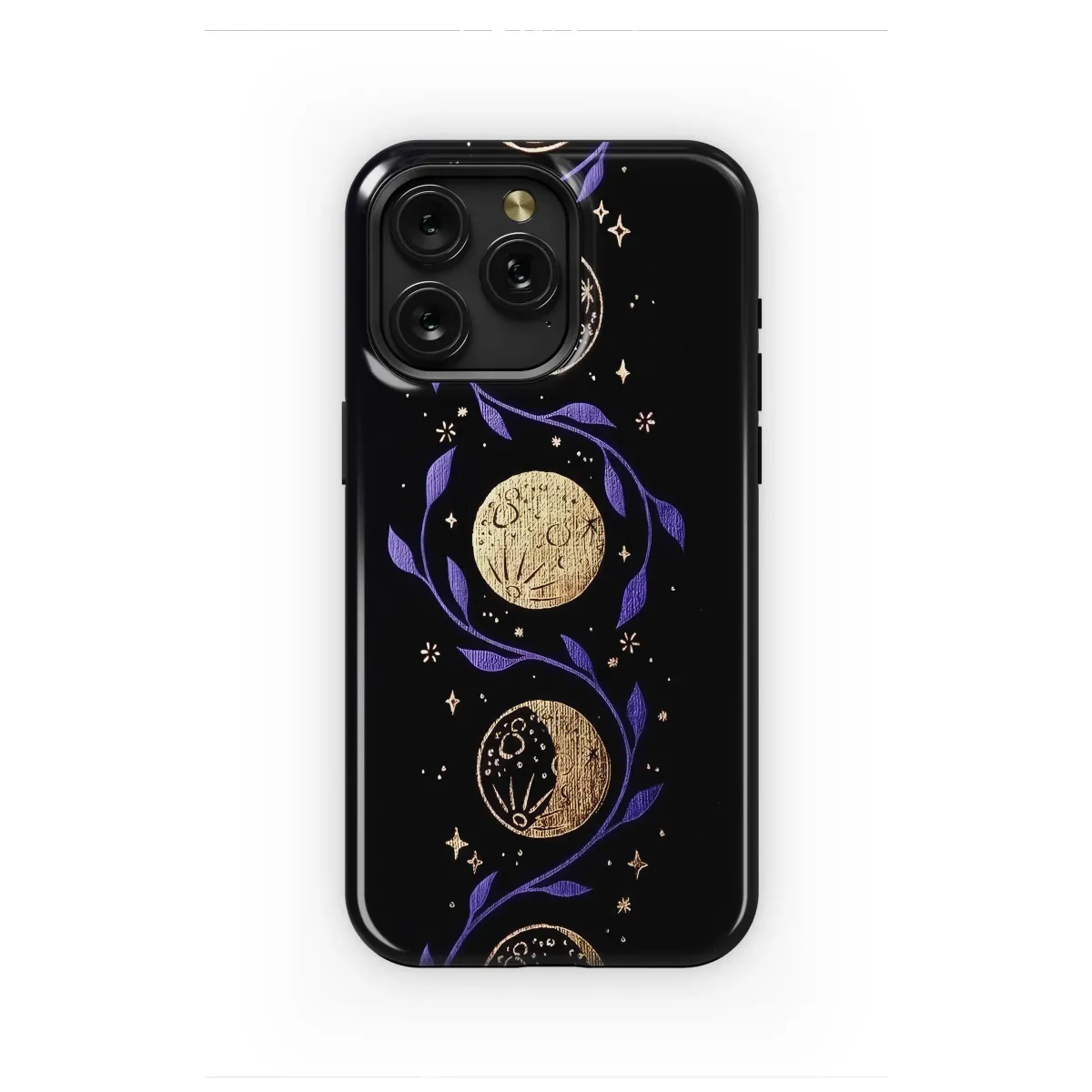 Immerse yourself in the quiet magic of a starlit night with this captivating celestial artwork. Against a deep, velvety black canvas, a delicate purple vine gracefully unfurls, its leaves weaving a mystical path through the cosmos. Cradled in this gentle embrace are the luminous phases of the moon, each one meticulously illustrated in a shimmering, textured gold that seems to hold the light of a distant star. From the slender sliver of the new moon to the radiant glow of the full moon, the entire lunar cycle unfolds in a mesmerizing vertical dance. Scattered like whispered secrets, tiny golden stars and sparkles twinkle, completing this ethereal scene and evoking the feeling of gazing into a clear, endless night sky. This design is more than just an image; it's a portal to a world of wonder, a personal talisman for the dreamer, the astrologer, and the soul who feels a deep connection to the celestial ballet. It's an ideal piece for anyone cultivating a witchy, boho, or dark academia aesthetic, bringing a touch of cosmic elegance and spiritual serenity to your most essential accessory. Let this lunar journey be a constant companion, reminding you of the universe's cyclical beauty and the magic that resides both above and within.