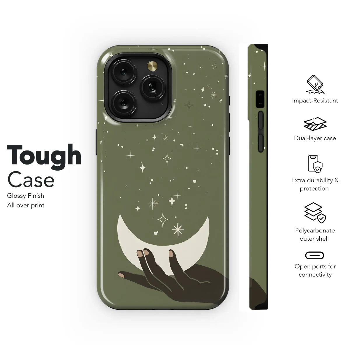 Embrace the celestial with this enchanting design, featuring a hand gently cradling a crescent moon amidst a shower of shimmering stars. The minimalist aesthetic and calming sage green backdrop create a serene and sophisticated vibe, perfect for those who appreciate subtle beauty and celestial magic. This design transforms any surface into a captivating piece of art, adding a touch of mystical elegance to your everyday life. The delicate lines and soft color palette create a calming and dreamlike effect. Express your unique style with this understated yet striking design, a testament to the quiet power of the cosmos. This captivating artwork is sure to turn heads and spark conversation, making it the perfect accessory for those who appreciate artistic detail and celestial wonder. Add a touch of cosmic elegance to your personal style. Its simple yet striking design is perfect for those who love subtle beauty and stargazing. This design evokes a sense of calm and wonder, a perfect reflection of your inner peace and appreciation for the beauty of the universe. This print elevates your everyday life with a touch of dreamy celestial magic.