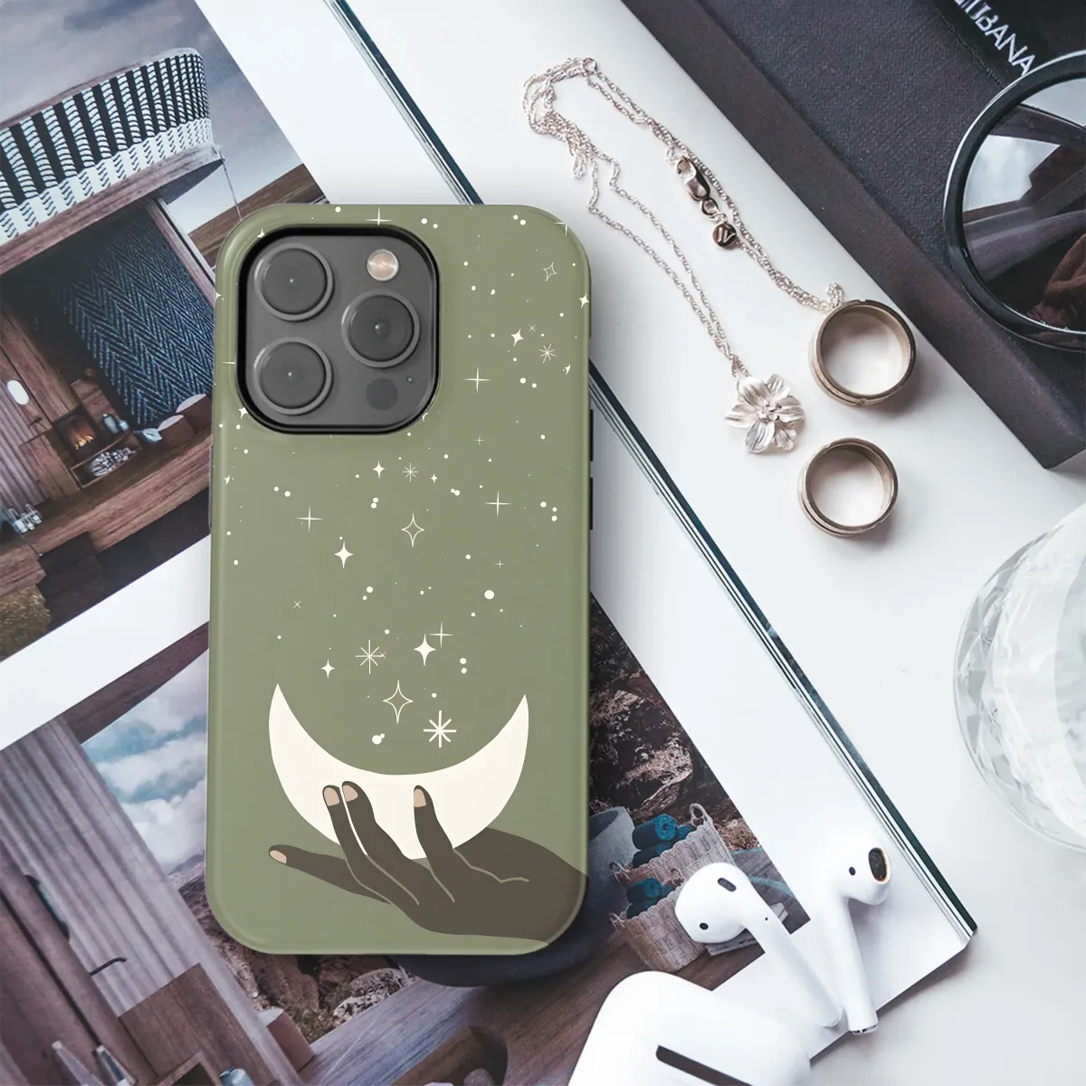 Embrace the celestial with this enchanting design, featuring a hand gently cradling a crescent moon amidst a shower of shimmering stars. The minimalist aesthetic and calming sage green backdrop create a serene and sophisticated vibe, perfect for those who appreciate subtle beauty and celestial magic. This design transforms any surface into a captivating piece of art, adding a touch of mystical elegance to your everyday life. The delicate lines and soft color palette create a calming and dreamlike effect. Express your unique style with this understated yet striking design, a testament to the quiet power of the cosmos. This captivating artwork is sure to turn heads and spark conversation, making it the perfect accessory for those who appreciate artistic detail and celestial wonder. Add a touch of cosmic elegance to your personal style. Its simple yet striking design is perfect for those who love subtle beauty and stargazing. This design evokes a sense of calm and wonder, a perfect reflection of your inner peace and appreciation for the beauty of the universe. This print elevates your everyday life with a touch of dreamy celestial magic.