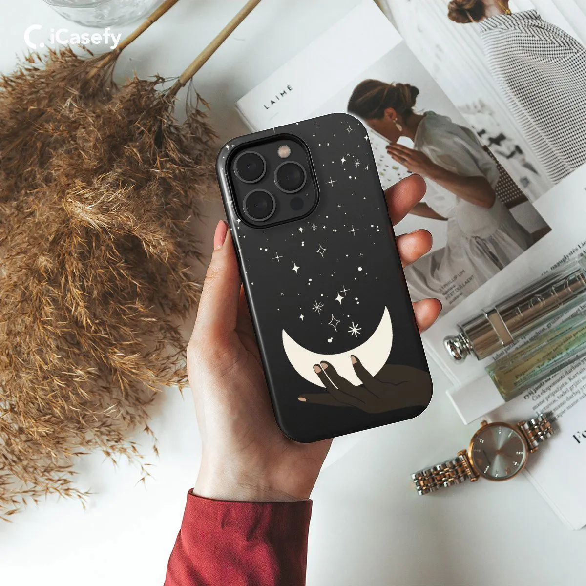 A celestial design featuring a mystical hand reaching for the moon. Available in Clear, Slim snap-on, and Tough case finishes, each option offers reliable protection while showcasing the enchanting celestial motif. Perfect for those who appreciate cosmic-inspired designs and celestial aesthetics.