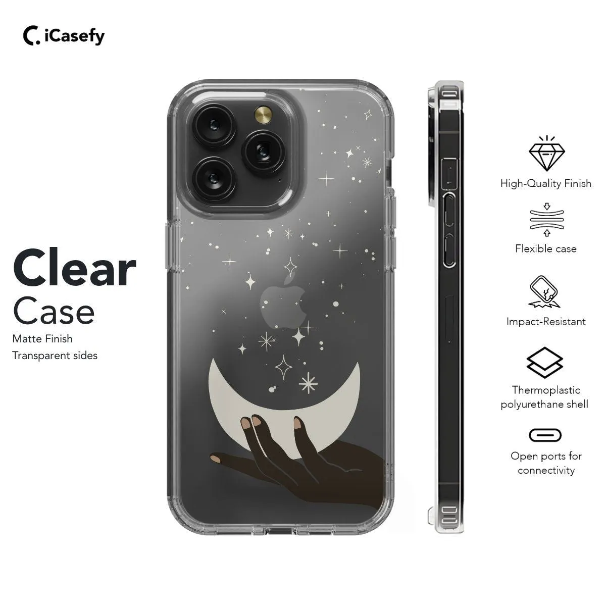 A celestial design featuring a mystical hand reaching for the moon. Available in Clear, Slim snap-on, and Tough case finishes, each option offers reliable protection while showcasing the enchanting celestial motif. Perfect for those who appreciate cosmic-inspired designs and celestial aesthetics.
