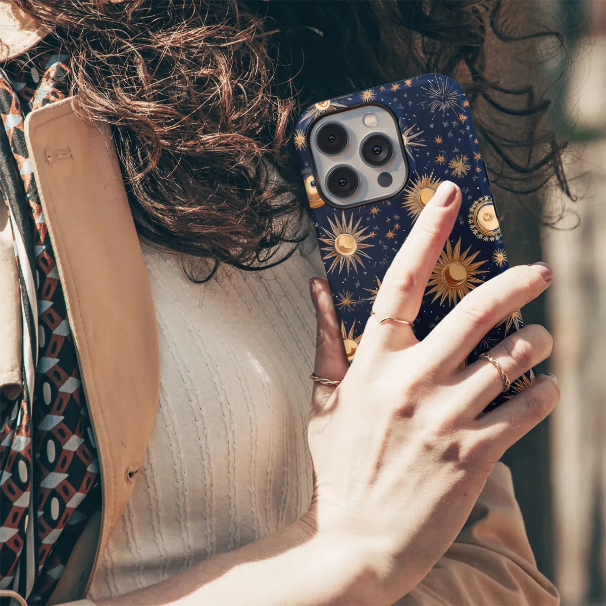 Adorn your device with the celestial charm of this captivating design. Evoking a sense of cosmic wonder, this artwork features a mesmerizing pattern of radiant suns, crescent moons, and twinkling stars scattered across a deep, enchanting navy backdrop. The intricate details, rendered in warm golden and ochre tones, create a sophisticated and ethereal aesthetic. Perfect for those who appreciate astrology, astronomy, or simply the beauty of the night sky. This unique print adds a touch of magic and personality to your everyday carry. Embrace the celestial trend and let your device shine like the stars with this stunning, otherworldly artwork. Showcase your love for the cosmos with this stellar design. Perfect gift for space lovers, astrology enthusiasts, or anyone who appreciates unique and eye-catching art.
