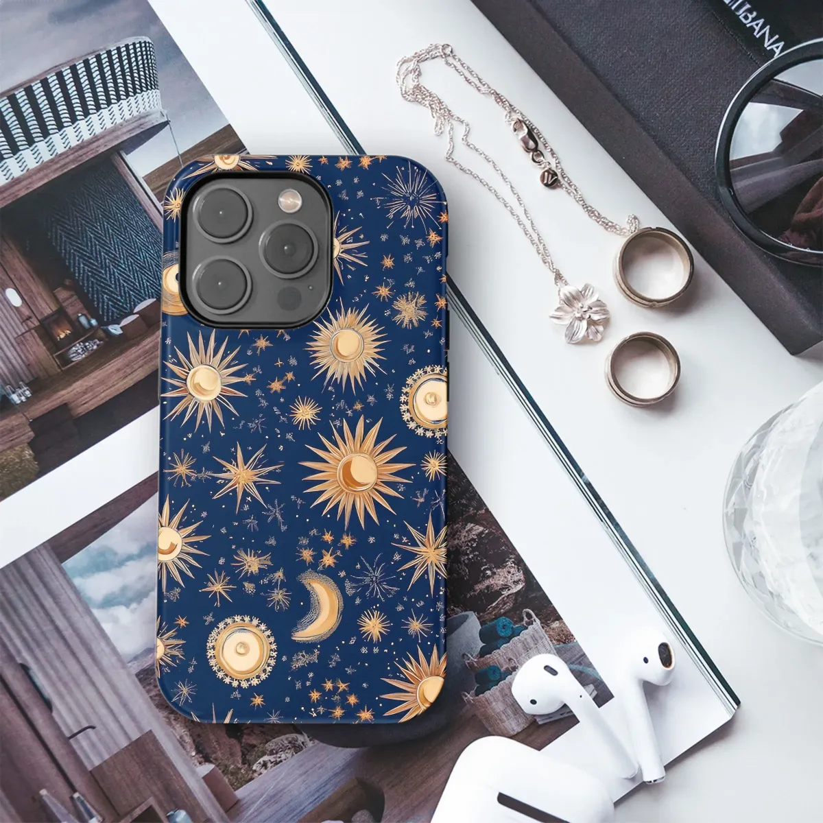 Adorn your device with the celestial charm of this captivating design. Evoking a sense of cosmic wonder, this artwork features a mesmerizing pattern of radiant suns, crescent moons, and twinkling stars scattered across a deep, enchanting navy backdrop. The intricate details, rendered in warm golden and ochre tones, create a sophisticated and ethereal aesthetic. Perfect for those who appreciate astrology, astronomy, or simply the beauty of the night sky. This unique print adds a touch of magic and personality to your everyday carry. Embrace the celestial trend and let your device shine like the stars with this stunning, otherworldly artwork. Showcase your love for the cosmos with this stellar design. Perfect gift for space lovers, astrology enthusiasts, or anyone who appreciates unique and eye-catching art.