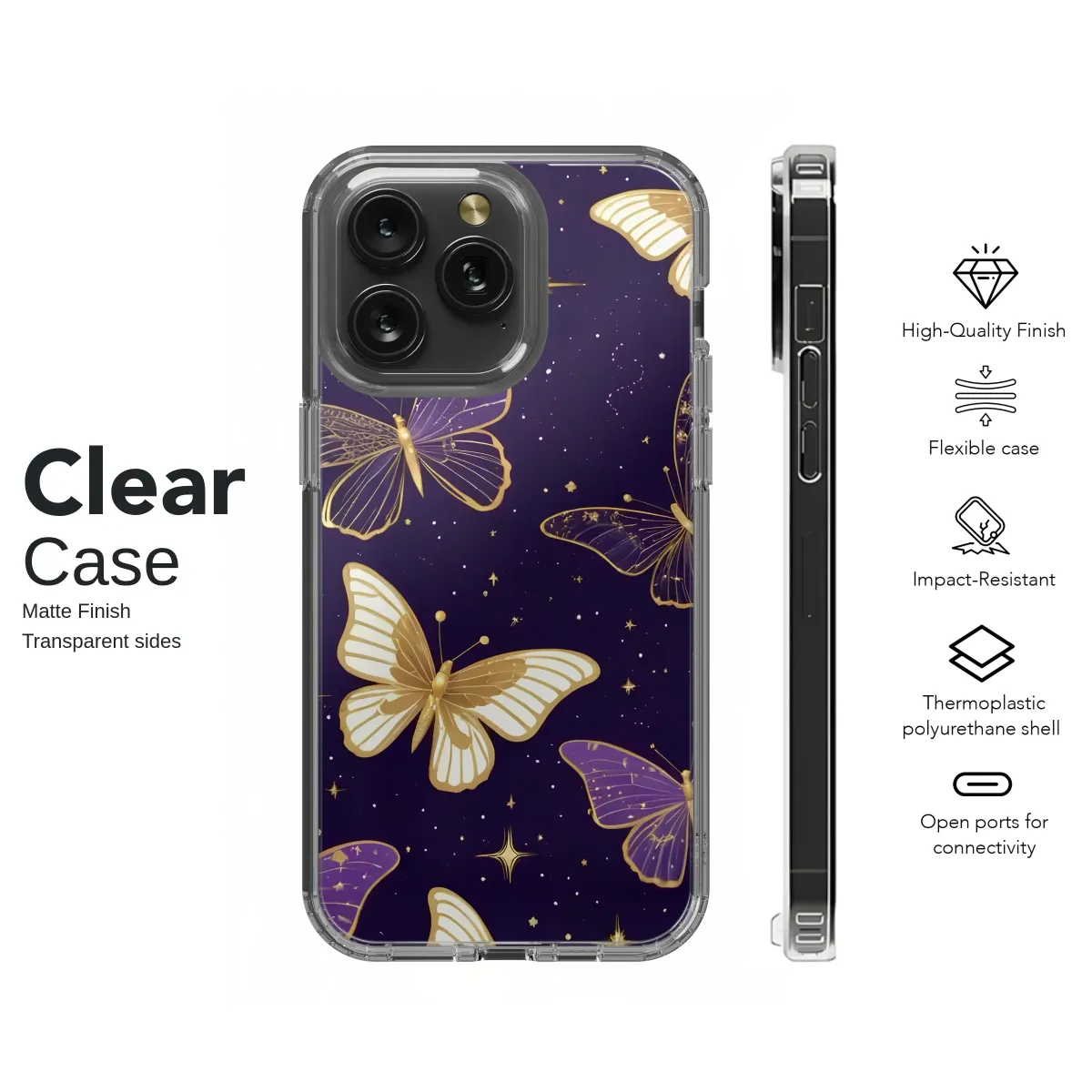 Wrap your world in the magic of a celestial midnight with this enchanting artwork. Picture a deep, velvety indigo sky, where a galaxy of tiny stars and golden crescent moons shimmer like scattered diamonds. Through this cosmic dreamscape, a silent ballet of ethereal butterflies unfolds. Their delicate wings, some crafted from pure, polished gold and others painted in the richest shade of royal amethyst, are traced with intricate gilded lines that catch the light with every movement. They flutter and float amongst twinkling starbursts, their flight a whimsical dance across the heavens. This design captures a fleeting moment of pure fantasy, blending dark academia elegance with a touch of mystical, witchy charm. It’s a perfect accessory for the modern romantic, the stargazer, and anyone who carries a little magic in their heart. Let this celestial butterfly pattern be a daily reminder of the beauty that exists in the universe and in your dreams. It's more than just an accessory; it's a portable piece of art that makes a thoughtful and unique gift for a loved one, or a beautiful way to express your own enchanting style.