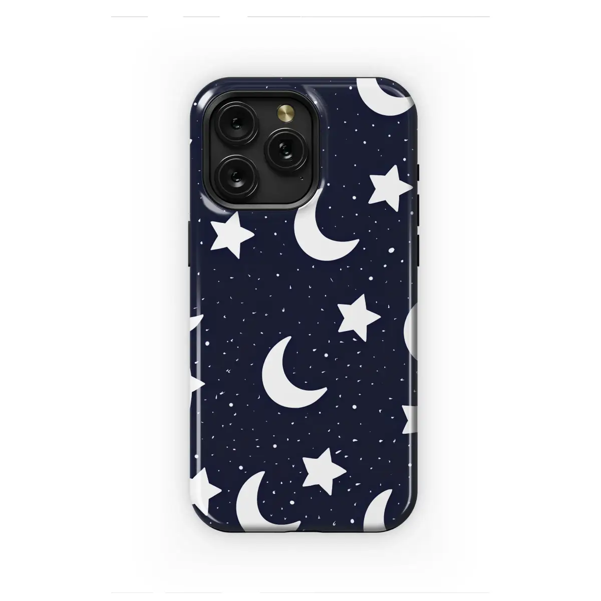 Embrace the magic of the cosmos with this charming celestial design. A whimsical pattern of crisp white crescent moons and stars dances across a deep navy blue backdrop, dotted with tiny specks to create the feel of a vast, starry night. This simple yet enchanting graphic is perfect for stargazers and dreamers alike.