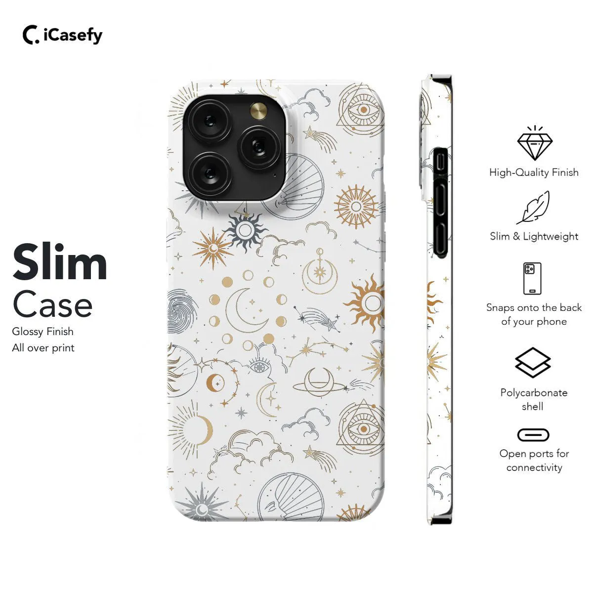 Embrace the celestial beauty of the cosmos with this enchanting phone case featuring a celestial moon and stars intertwined with astrological symbols. This accessory invites contemplation of the mysteries of the universe and the ancient wisdom of astrology. Carry a touch of cosmic inspiration with you wherever you go, letting your device become a portal to the wonders of the night sky with this mesmerizing and thought-provoking case.