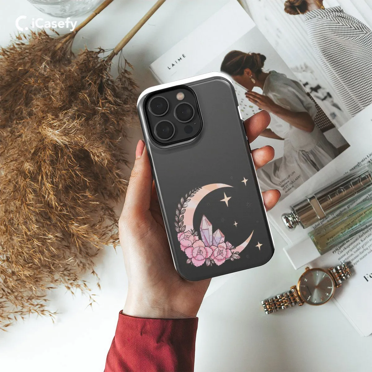 Indulge in the celestial beauty of the night sky with this enchanting phone case featuring moons, crystals, stars, and delicate floral accents. Inspired by the mystical allure of the cosmos and the serene elegance of nature, this case is a perfect blend of celestial and botanical elements. Embrace the magic of the universe and let your device shine with celestial splendor wherever you go.